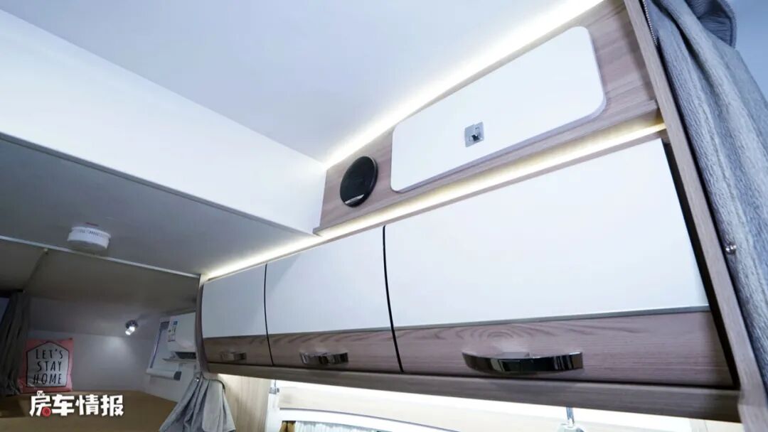 这款房车的休息区是采用了上下子母床的设计方式,总共可以容纳三个人使用,另外床位处还带有固定的爬梯,方便上床的人使用,另外在上铺的床头处还带有小型的储物柜,放一些化妆品或者是首饰,拿取起来都比较方便。在上床的侧面壁板上提供了一台家用变频空调,可以按需调节车内的冷暖。