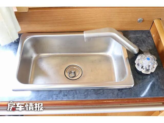 别看这辆小小的房车整体尺寸不大,但是内部还提供了一个简易的厨房操作台,并且配备了水槽,因为带有外接插座,后期也可以加装电磁炉,满足基本的做饭需求。