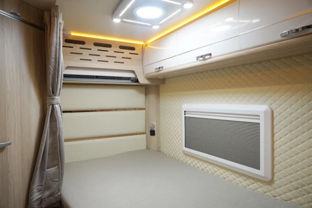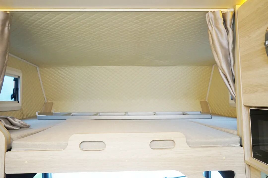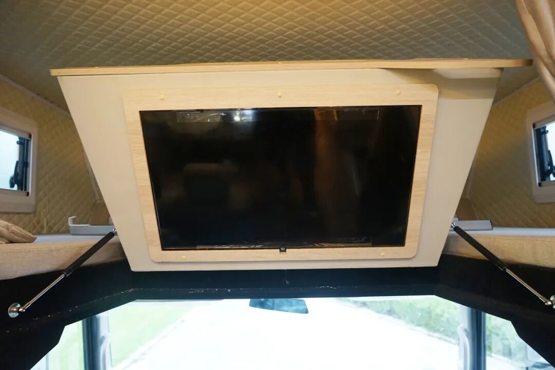 在驾驶室上方的额头区域内同样提供了一张额头双人床,虽然只有左右两侧带有小型的外推窗,但是也保证了这个区域的进光量,同时额头区域全部采用了皮质软包工艺,更好的防护了使用人员的安全,在折叠的床板下方隐藏了一台32寸的小米电视,连接上网络就可以轻松的追剧了。