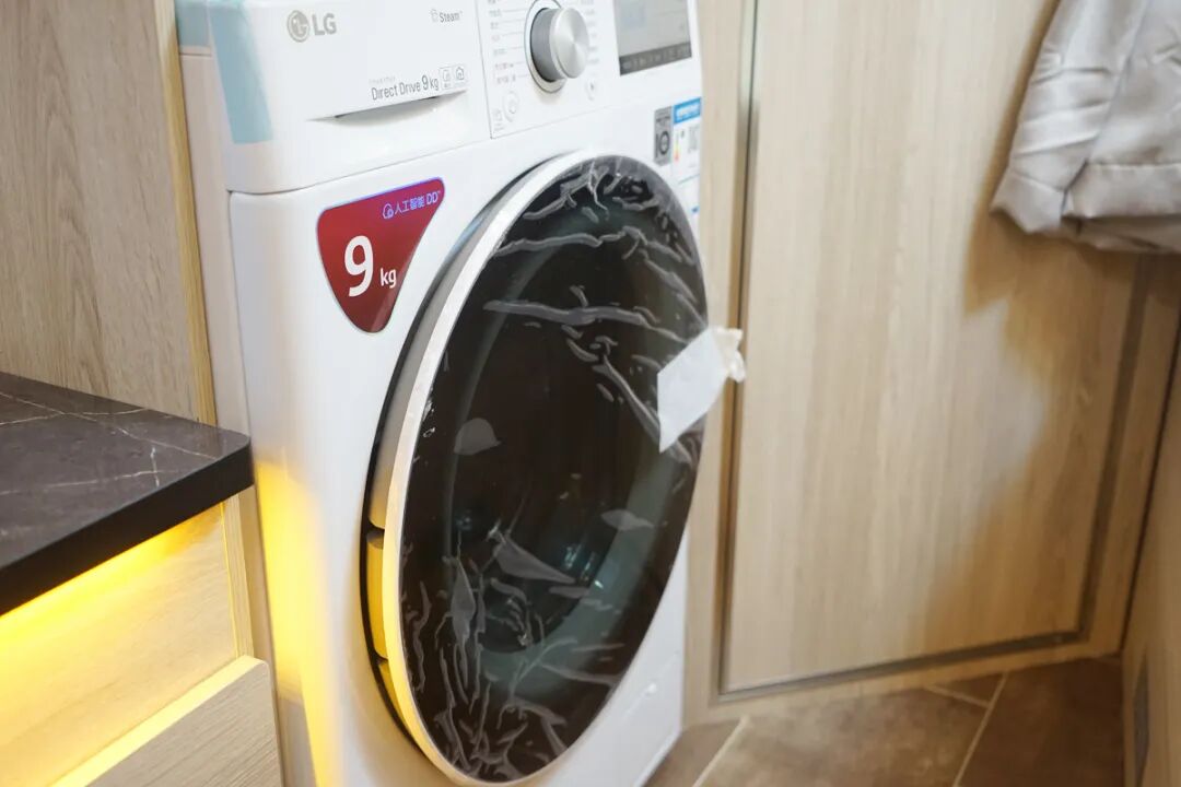 后方的衣柜下方镶嵌了一台家用的滚筒洗衣机,洗衣容量更大更方便使用。