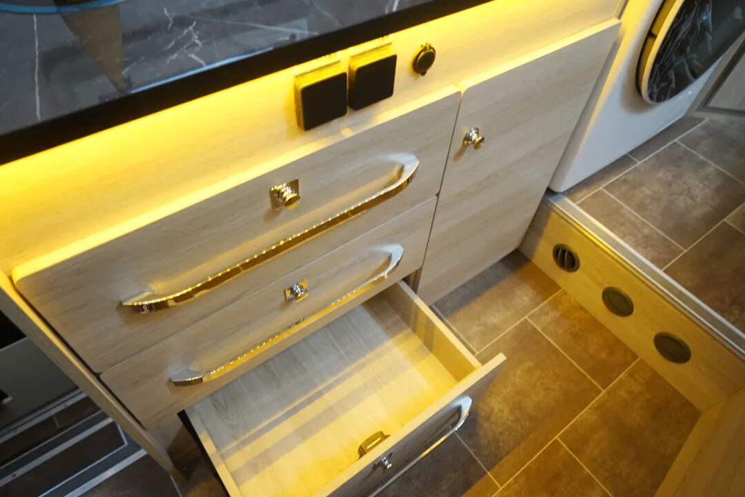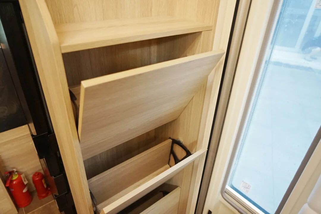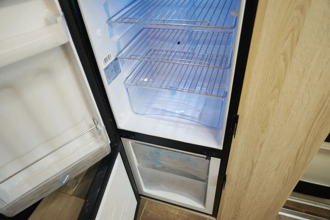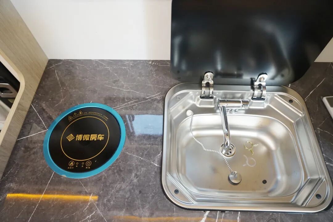 乘客门后方的厨房操作台算是比较中规中矩的设计,配置了电磁炉、带盖的水盆、抽油烟机以及储物空间,平时做饭炒菜都可以满足。