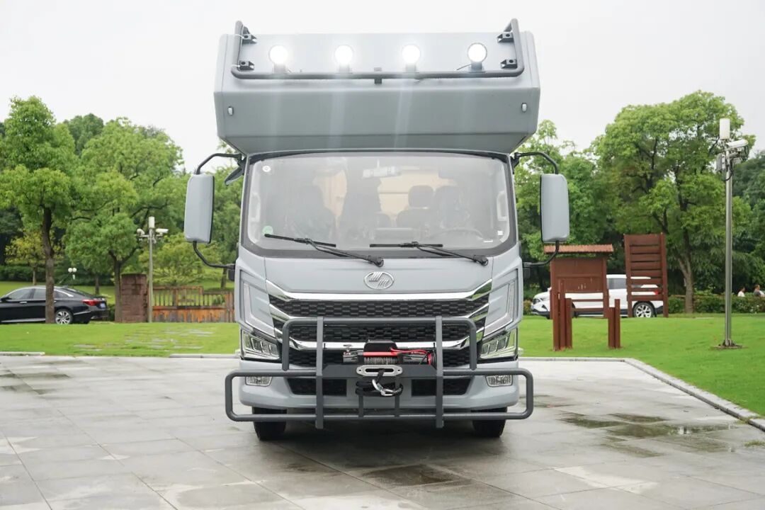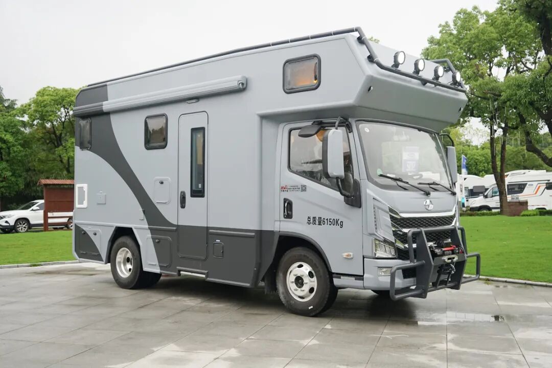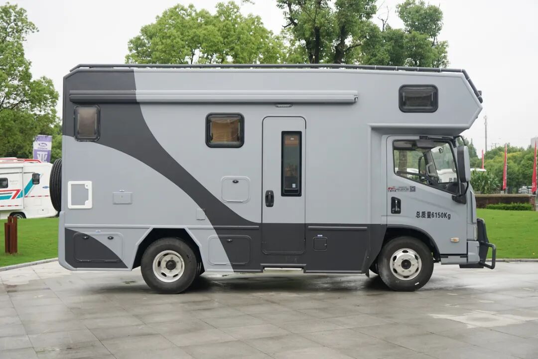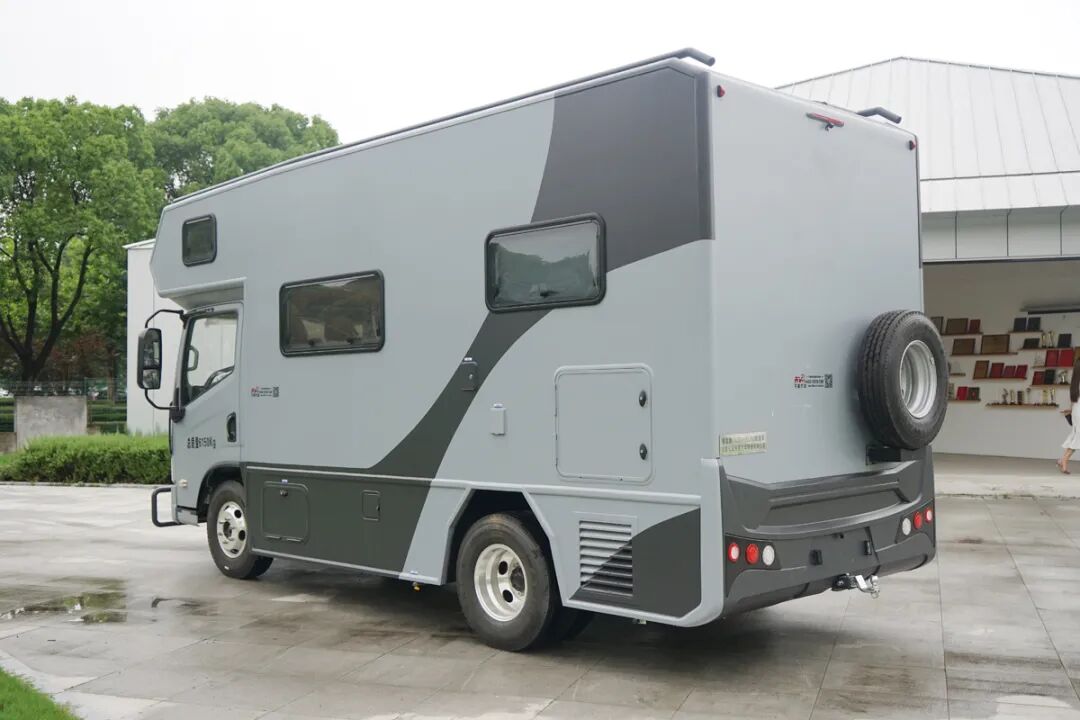 整车的外部看起来非常的规整,提供了遮阳棚、外置抽拉燃气灶、外置花洒、储物舱以及水电接驳口,满足在车外点火做饭的需求。