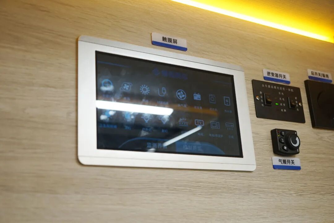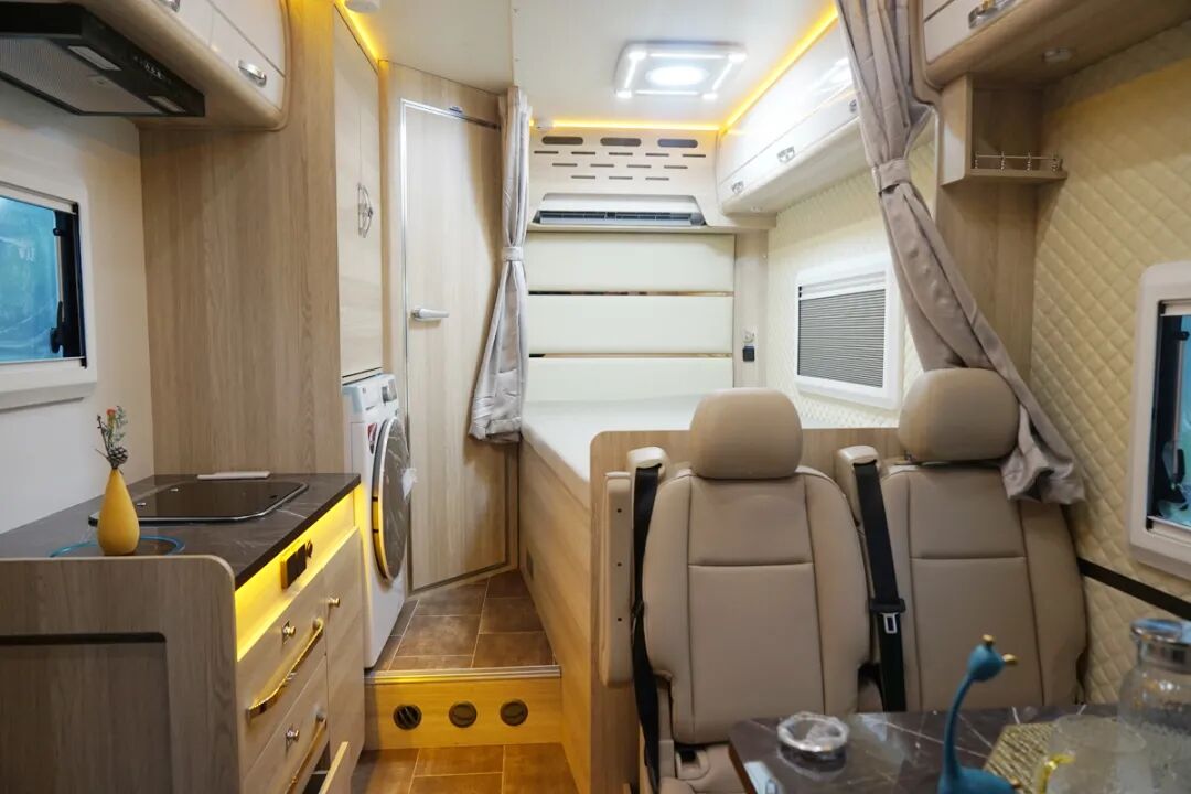 电路上,这款房车搭载了一台3000W的逆变器,提供800Ah的锂电池,在顶部还配备了800W的太阳能电池板;水路上则提供了260L的净水箱和100L的灰水箱,而且全车还提供了热循环电加热的48L热水器和5000W的燃油暖风供平时使用。