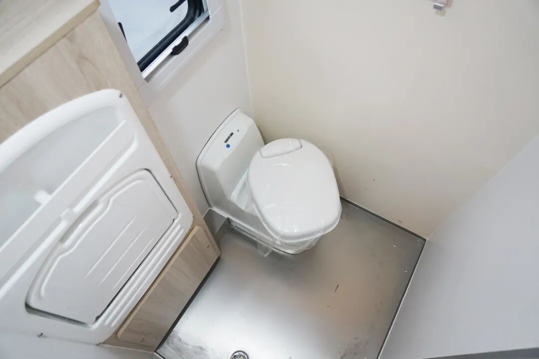 最后是整车的卫浴室,内部的设计也非常的简洁明了,提供了马桶、翻折的洗手台、淋浴花洒、储物柜等,出行的洗澡上厕所问题都完全可以解决。