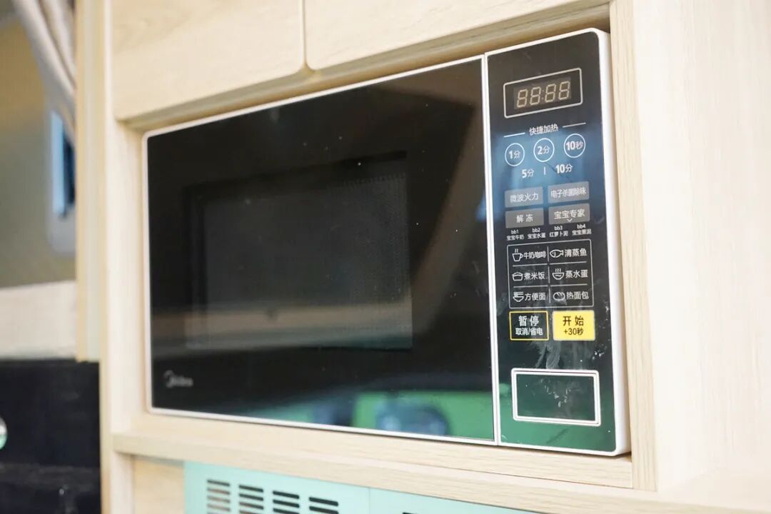 与之相对的是镶嵌在储物柜中的一台148L上下双开门冰箱,上方还提供一台微波炉及一个储物柜,侧面则设计成了立式的鞋柜,既节省了整体空间,又非常的实用。