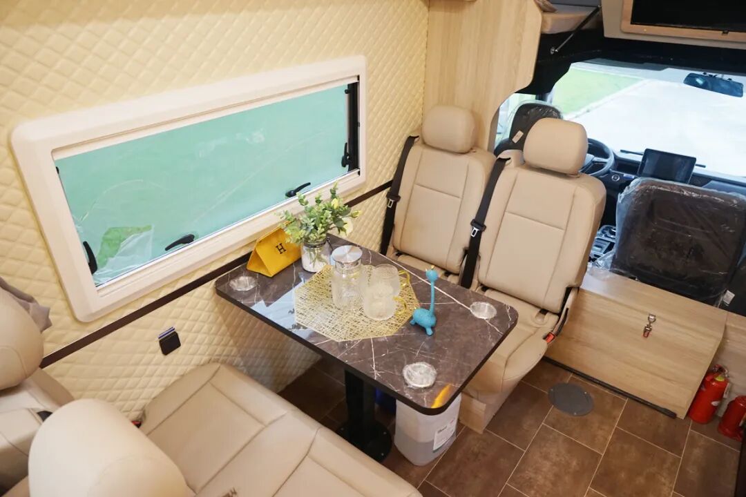 会客区采用了最常见的四人对卡座形式,采用了乘用车级别的座椅可以让乘车人得到更舒适的乘坐体验,而且侧面的壁板采用了皮质软包工艺,更是提升了整体的档次。另外在上方也设置了多个储物吊柜,提升整车内部的储物空间。