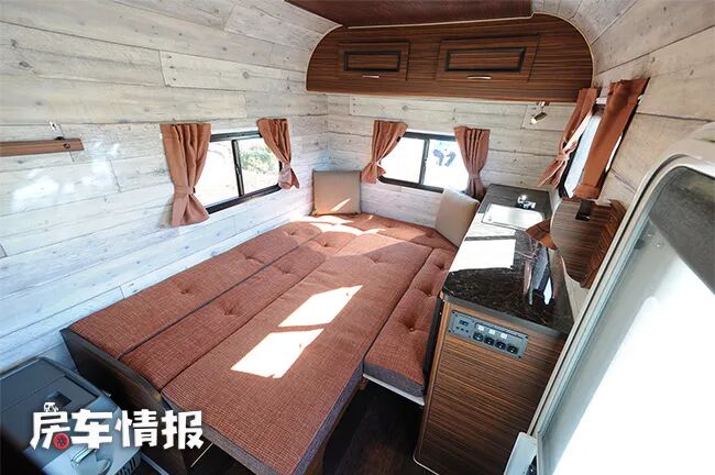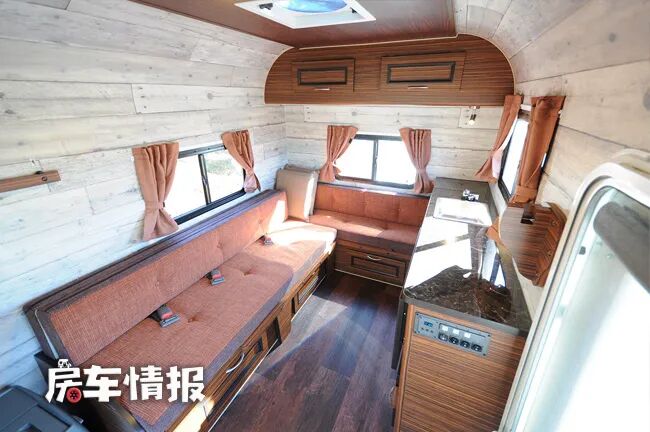 从车身左侧进入车厢里,内部的装修风格也别具一格,特别的复古,整车内部的墙壁全部采用了原木的粘贴,让用户更加贴近了大自然,而红棕色的家具也起到了整体的协调作用,就像是走进了森林木屋的感觉一样。