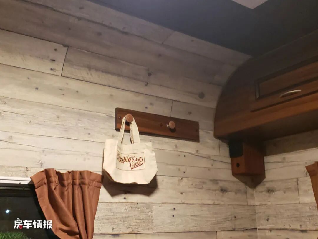 车厢内部的高度也得益于顶部的圆弧造型,纵向增大了生活空间,尾部还提供了木质的储物吊柜,存放一些小件的日用品也还够用,另外还带有挂衣钩,更营造出了家的感觉。
