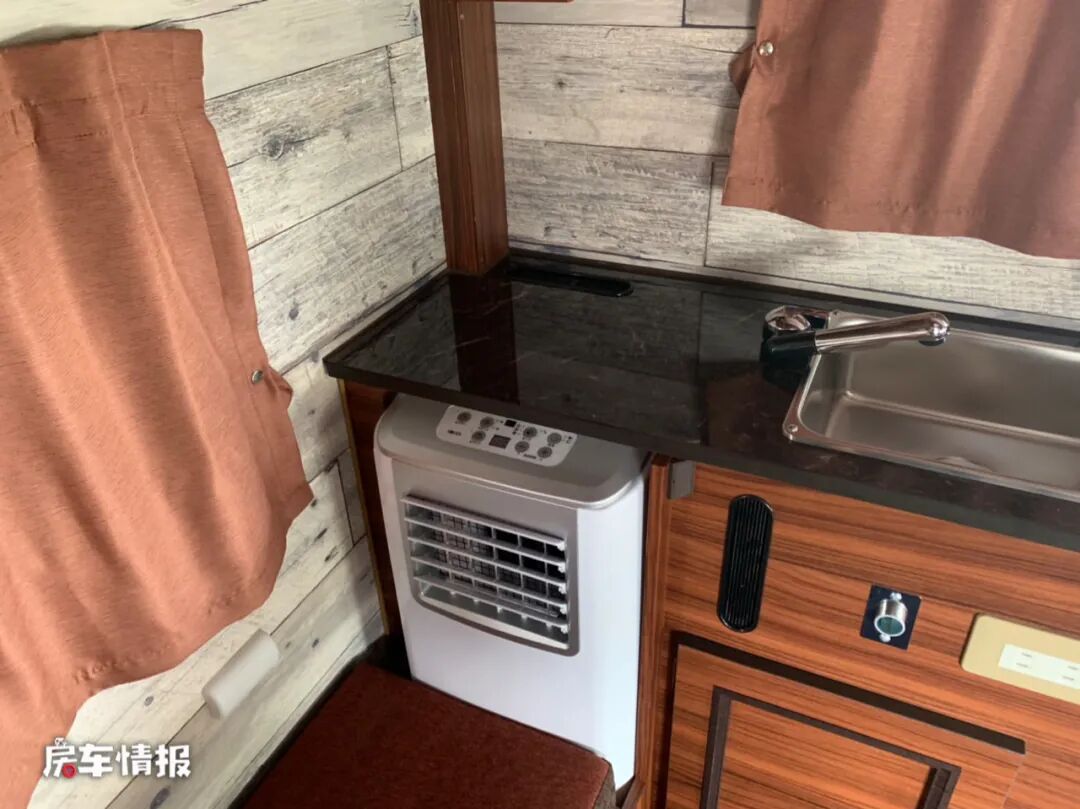 电路上,这款房车标配105Ah的电池,当然如果有更多的用电需求,后期也可以选装2000W的逆变器,或者再增加一块105Ah的副电池,顶部也可配备40W的太阳能电池板;水路上则提供了19L的净水箱和19L的排水箱。