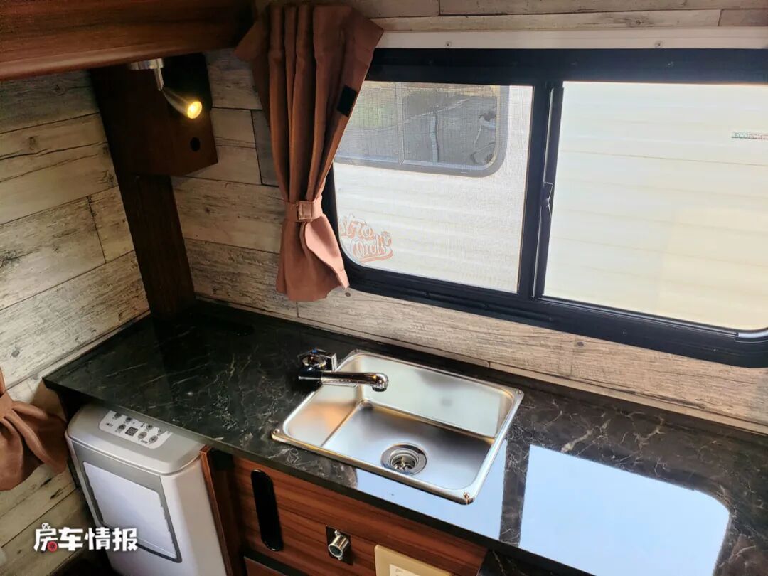 而乘客门后方贯穿到尾部的长条厨房操作台真的是非常的阔气,不仅提供了大尺寸的水槽,而且两边分别留有空置的平台,可以加装更多的厨用小电器,来满足更多的生活需求。