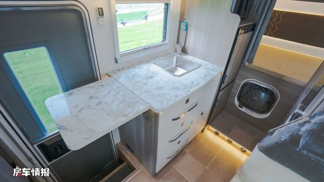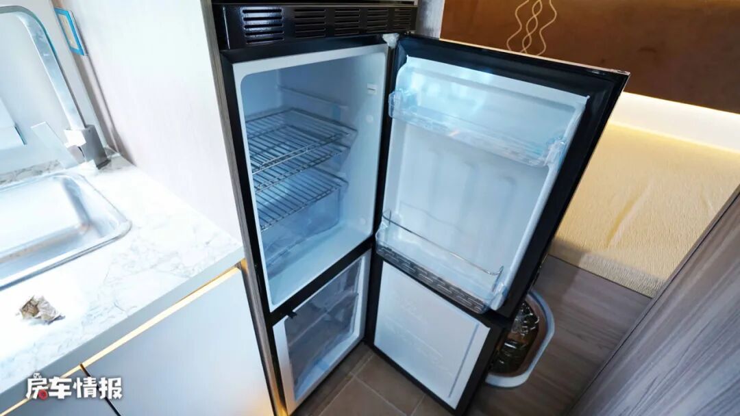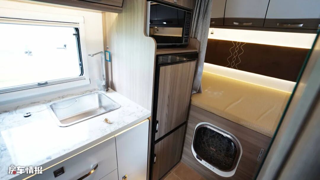 厨房区的面积虽然不是很宽敞,但是也提供了可拓展的小桌板,可以增大原始的使用面积,同时整个厨房区提供了储物空间、不锈钢水槽、微波炉以及一台152L上下双开门的冰箱,结合车外的抽拉式燃气灶,也可以满足出行的做饭用餐需求。
