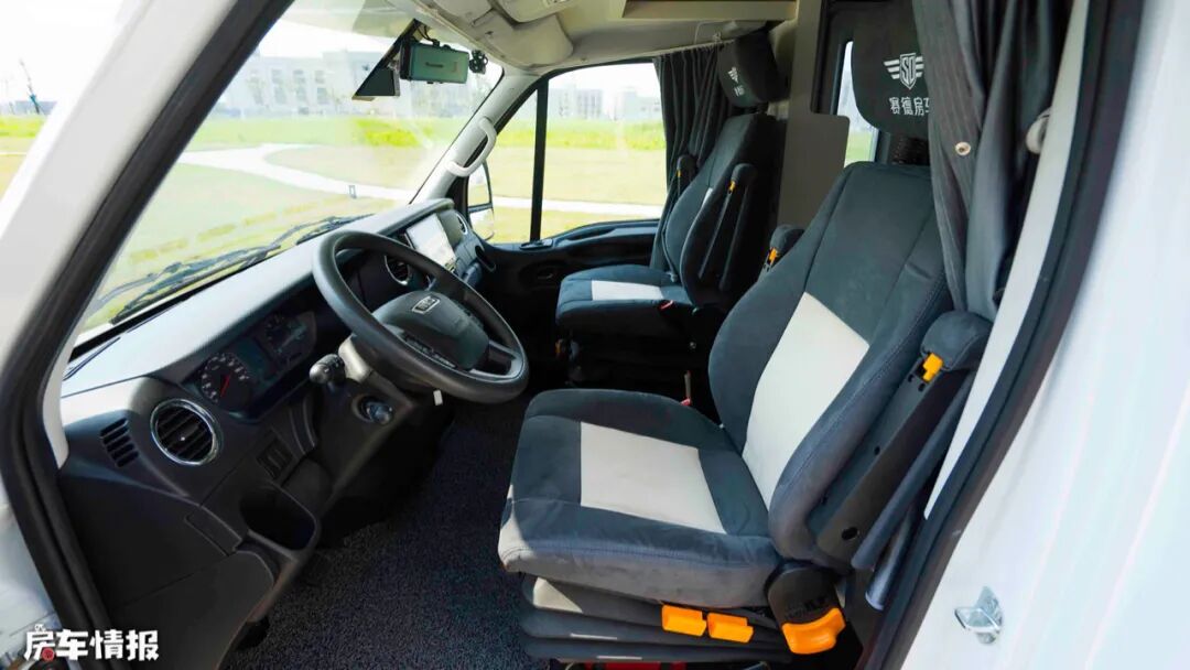 国六底盘的依维柯在驾驶室标配了多功能方向盘和中控彩色触控大屏、ABS防抱死系统、ESP、定速巡航、车道偏离预警、胎压监测、以及主副驾驶座椅安全气囊等,可以全面提升整车行驶的安全性。