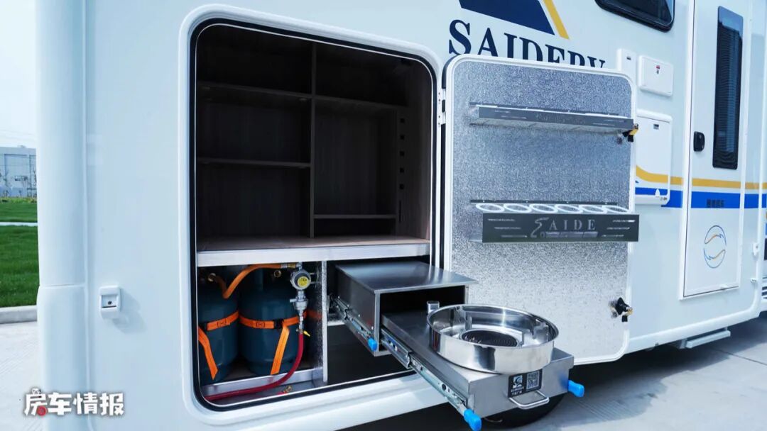 车身外部匹配了比较丰富的户外生活设施,包括遮阳棚、外置翻板、储物舱、抽拉燃气灶、水电接驳口等,可以满足户外的生活需求。