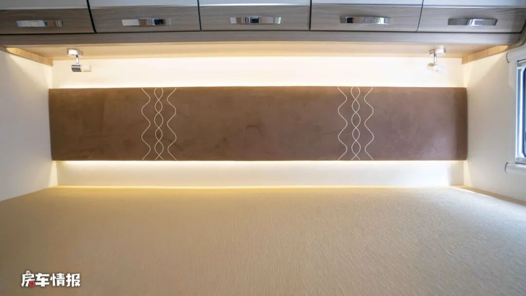 这款房车同其他几款白鲸PLUS的区别除了会客区的布局,还有一个不同就在于车尾部休息区的布局,是采用了后置横床的设计,横床相比纵床来说私密性更好一些,整床的大小尺寸为2200mm*1150mm,平时也可以满足两个体型比较娇小的成年人睡觉和休息的需求,同时侧面的壁板上还加入了非常时尚的氛围灯设计,为休息区营造出了更加温馨的感觉,上方还提供了一排储物吊柜,可以存放平时换洗的衣物,拿取的时候也比较顺手方便。尾床的高度稍高一些,因为下方还镶嵌了一台洗衣机,方便平时清洗衣物。