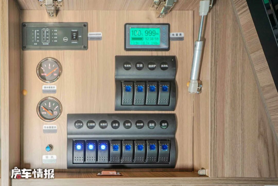 电路上,这款房车搭载了一台3000W的逆变器,提供了两组共1000Ah的锂电池,后期如果有更多的用电需求也可选配太阳能电池板;水路上则提供了280L的净水箱和60L灰水箱,完全可以满足出行的用水用电需求。