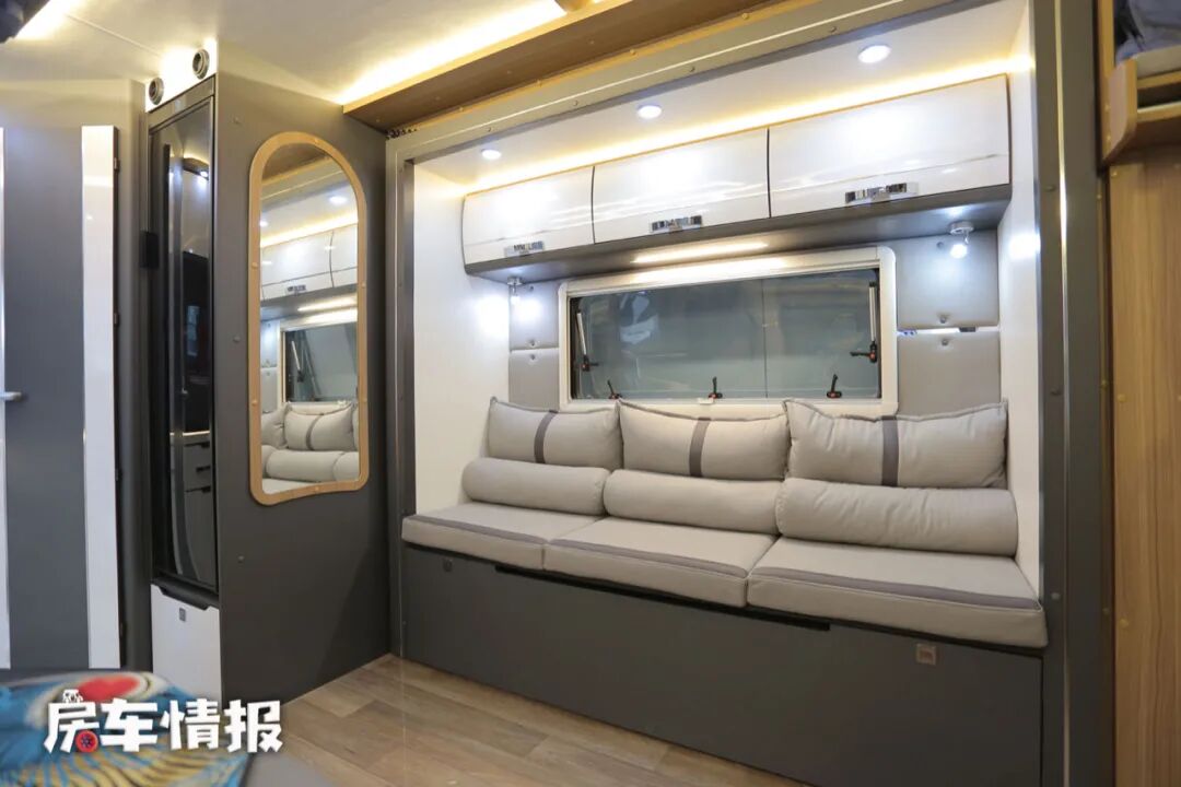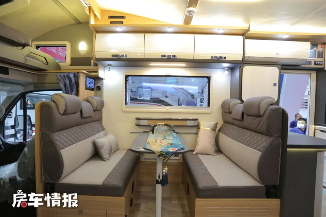 与之相对的是常见的四人对坐沙发会客区,配备四条安全带,加上正副驾驶座椅,整车最多核载6人。整体的空间还算宽敞,平时在这里吃饭或是工作都是很好的选择,晚上则可以将餐桌移开,拓展成一张双人沙发床,足够两个成年人使用,同时上方也提供了多个储物空间。