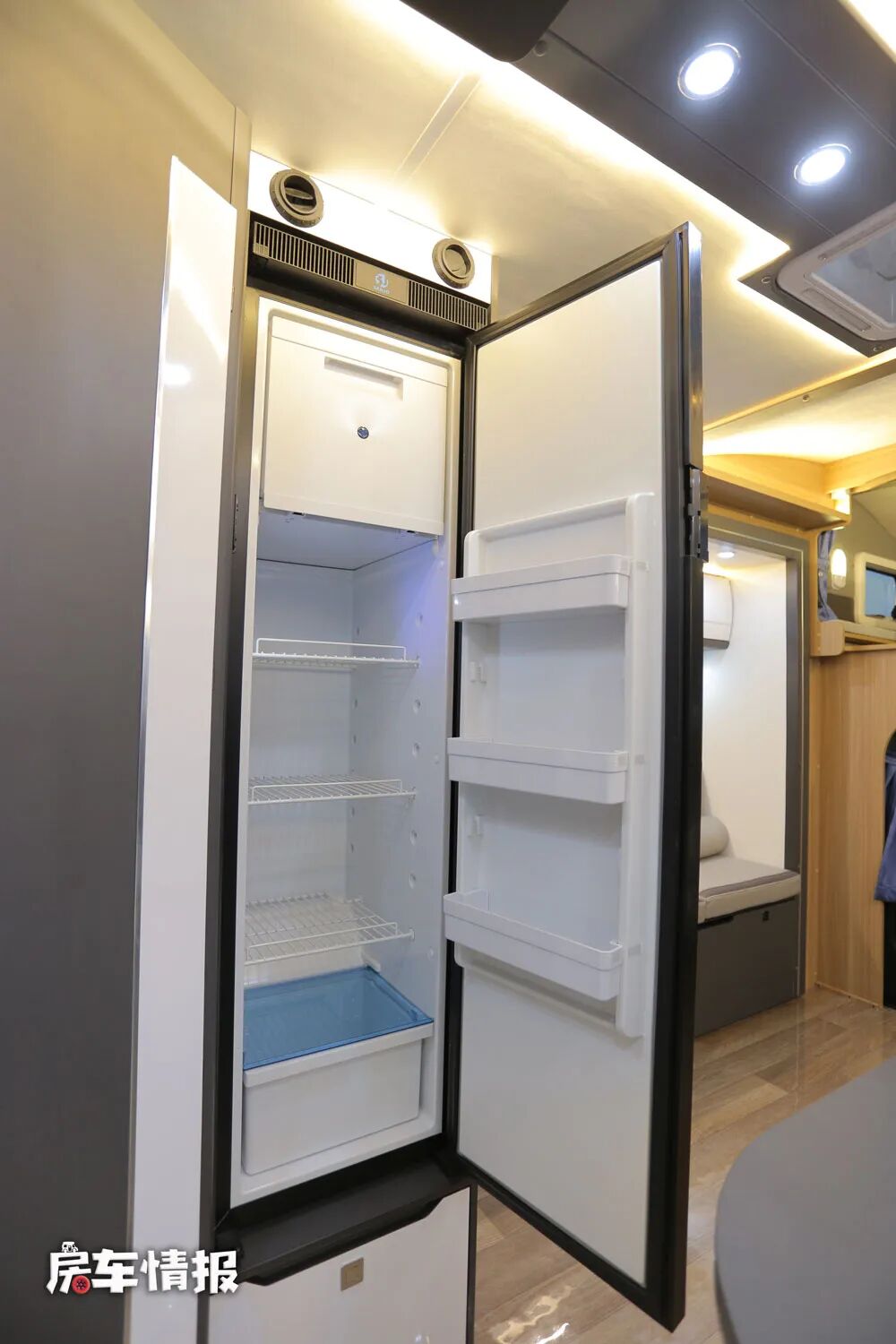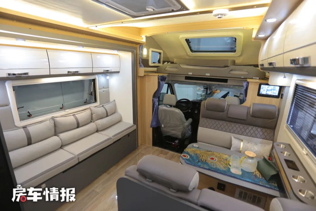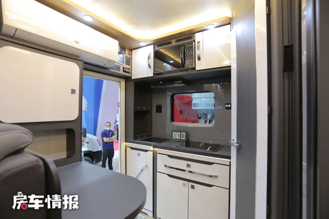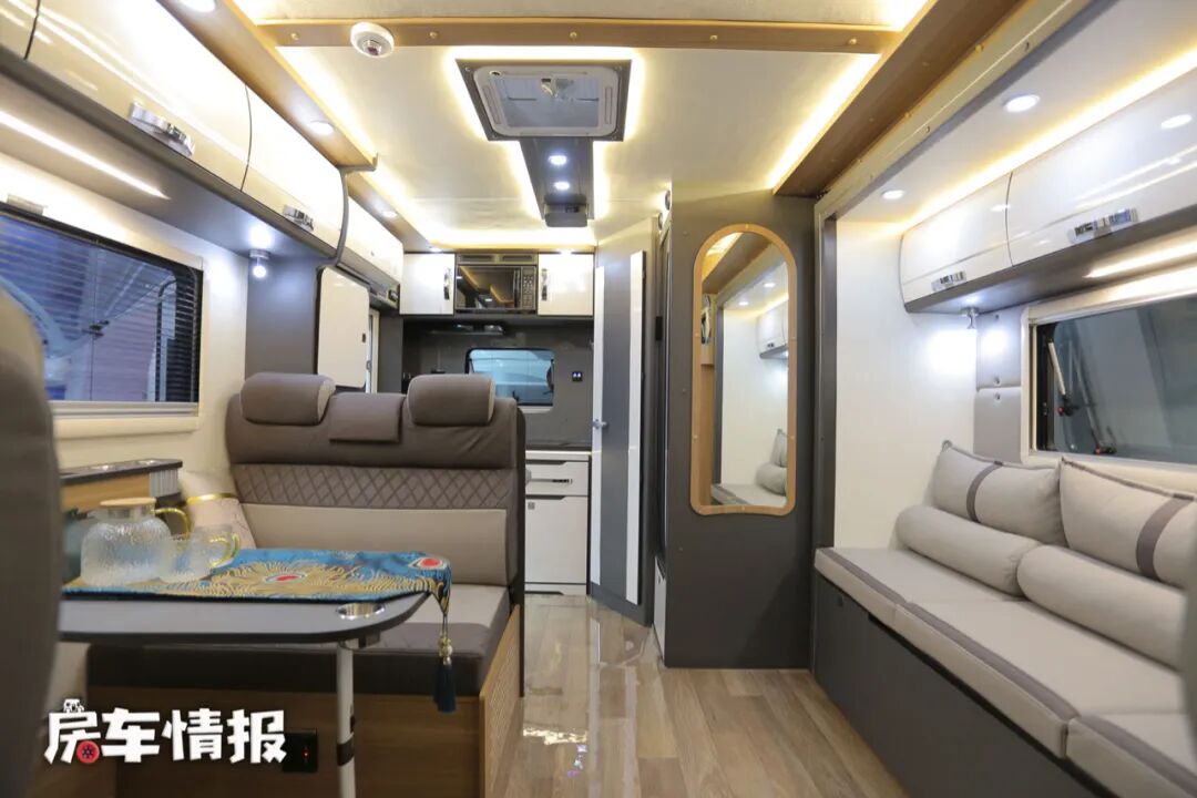 全车采用了一个右后上门的方式,所以平时我们常见的厨房区被转移至到了车厢尾部,车内的光线还是非常的明亮的,灰色系的配色提升了整体的商务质感。