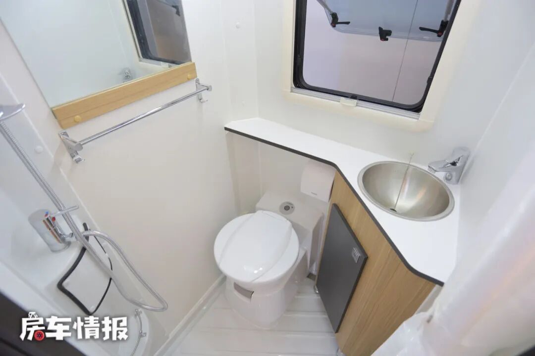 同样在车厢尾部的还有卫浴室,内部也提供了齐全的洗漱设施,包括马桶、洗手台、储物空间、淋浴花洒、梳妆镜和换气扇,平时的洗漱淋浴需求还是完全可以满足的。