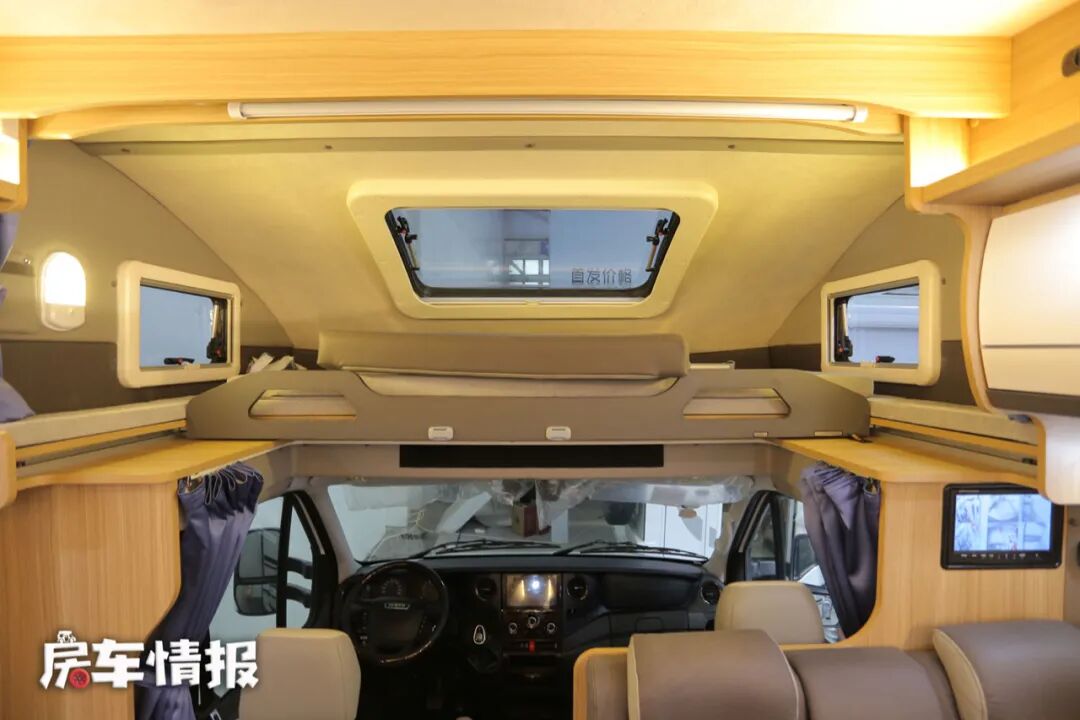 全车取消了常见的固定床,取而代之的则是位于拓展区域内的一排长条沙发,不过要注意的是,因为没有配置安全带,所以这排沙发在平时行车中不能够坐人的,但是平时驻车时可以躺在这里小憩,晚上睡觉的时候还可以拓展成一张沙发床,睡一个大人或者两个小朋友都是没有问题的,顶部还提供了储物空间,方便平时储物。