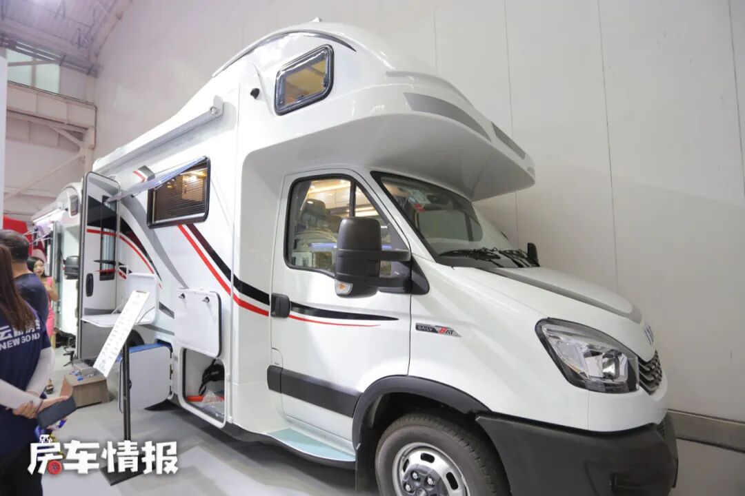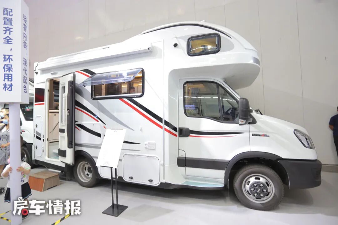 这款房车搭载了2021最新款的依维柯欧胜底盘,全车的长宽高尺寸为5995mm*2300mm*3200mm,轴距为3300mm,同时全车加宽了后桥轮距,提升了行驶的平稳性,另外圆润的大额头,搭配车身上红黑灰色的彩条,也使整车看起来非常的灵动有线条感,而且也非常的简约时尚。