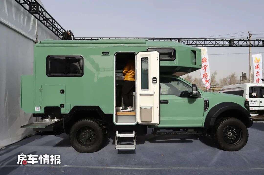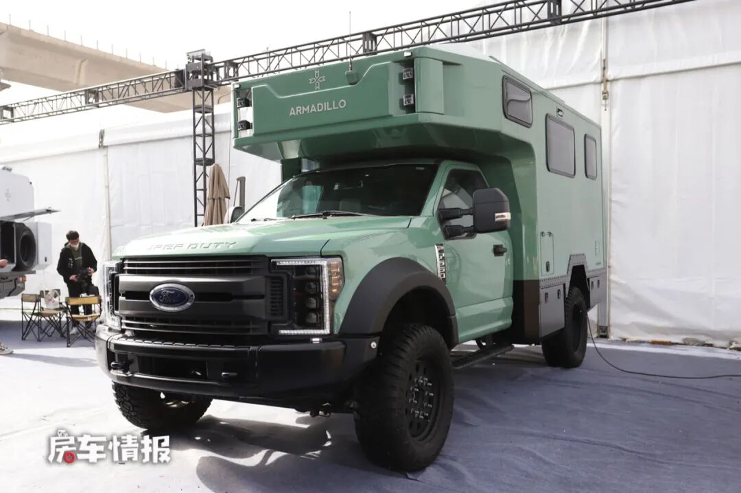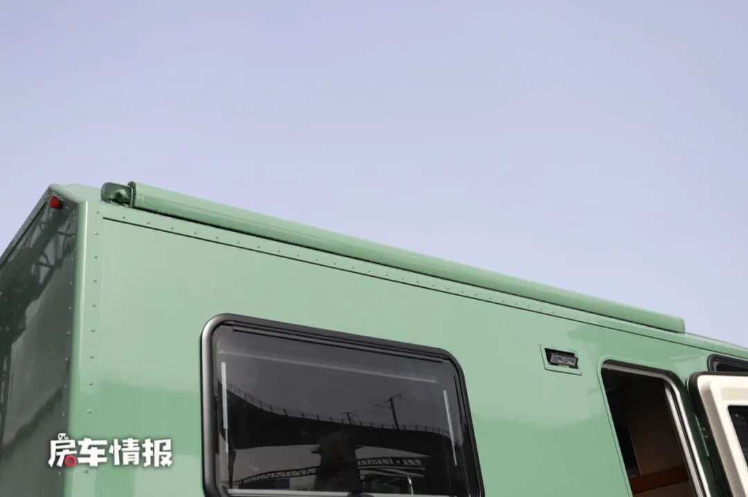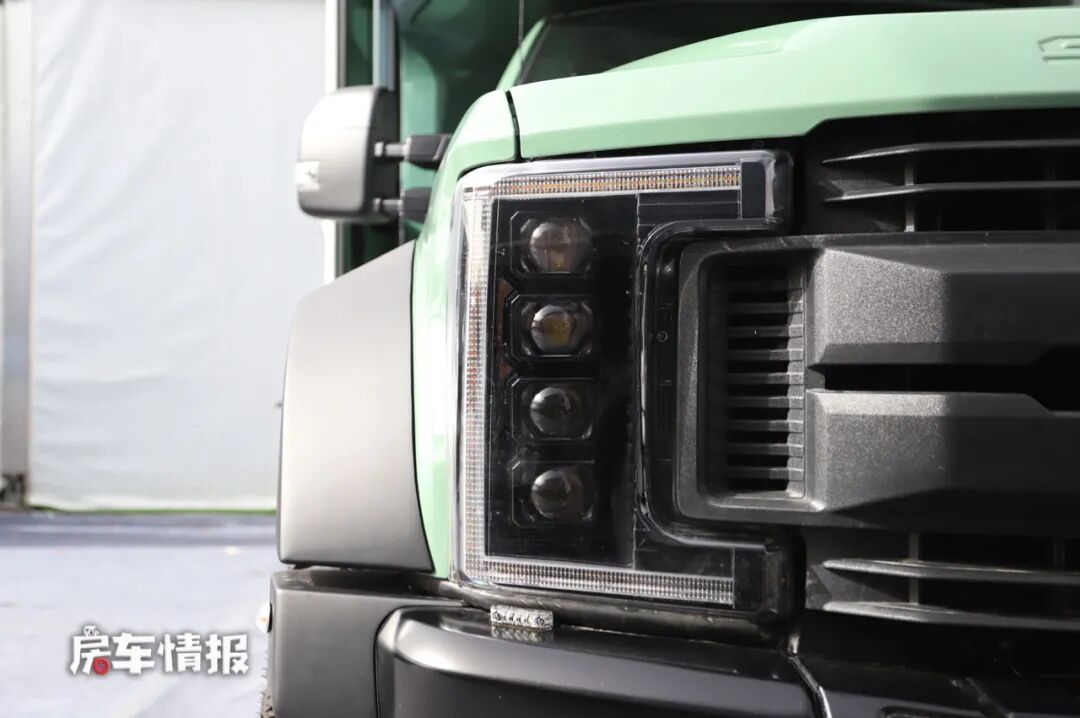 这款房车是基于福特F550底盘打造的,通体为非常时尚的牛油果绿色,搭配前脸全熏黑的前格栅非常有冲撞力,大灯的造型也更为的方正有质感,另外车顶上方的额头前还配置了四个越野射灯。全车的尺寸为5995mm*2340mm*3050mm,虽然外观看起来十分高大,但是车身不到六米,还是能够满足蓝牌C本驾驶的,然而高挑的身材平时也会受到限高的影响,行车上路还是需要注意提示的。