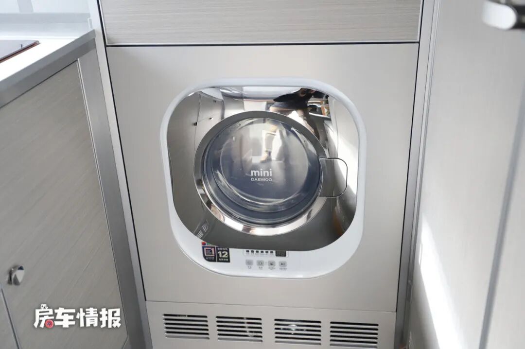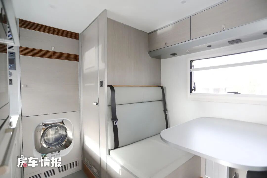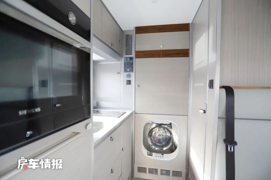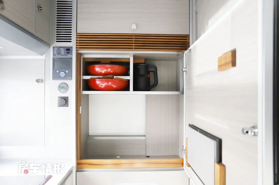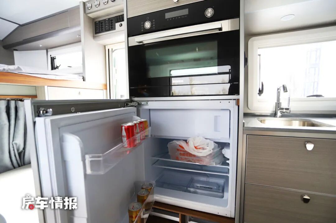 临近乘客门的一侧是一个上下贯通的置物柜,上方装配了一台嵌入式微博蒸烤一体机,下方则提供了一台125L的冰箱。