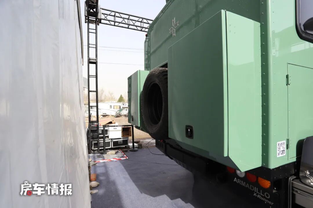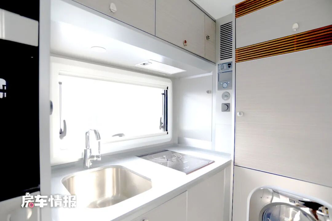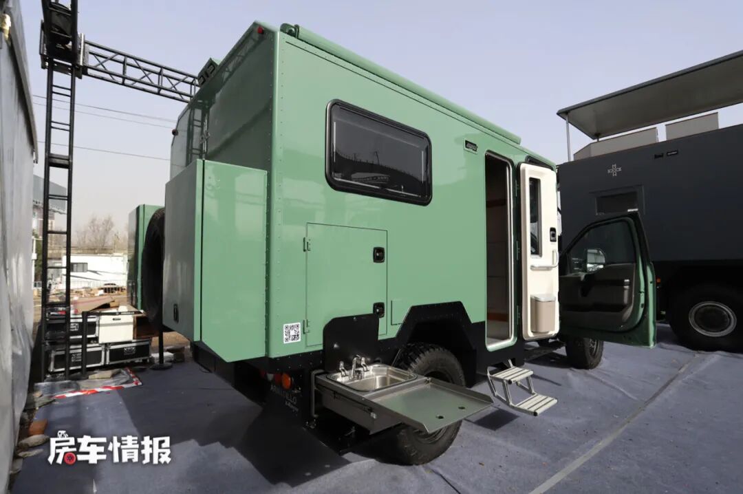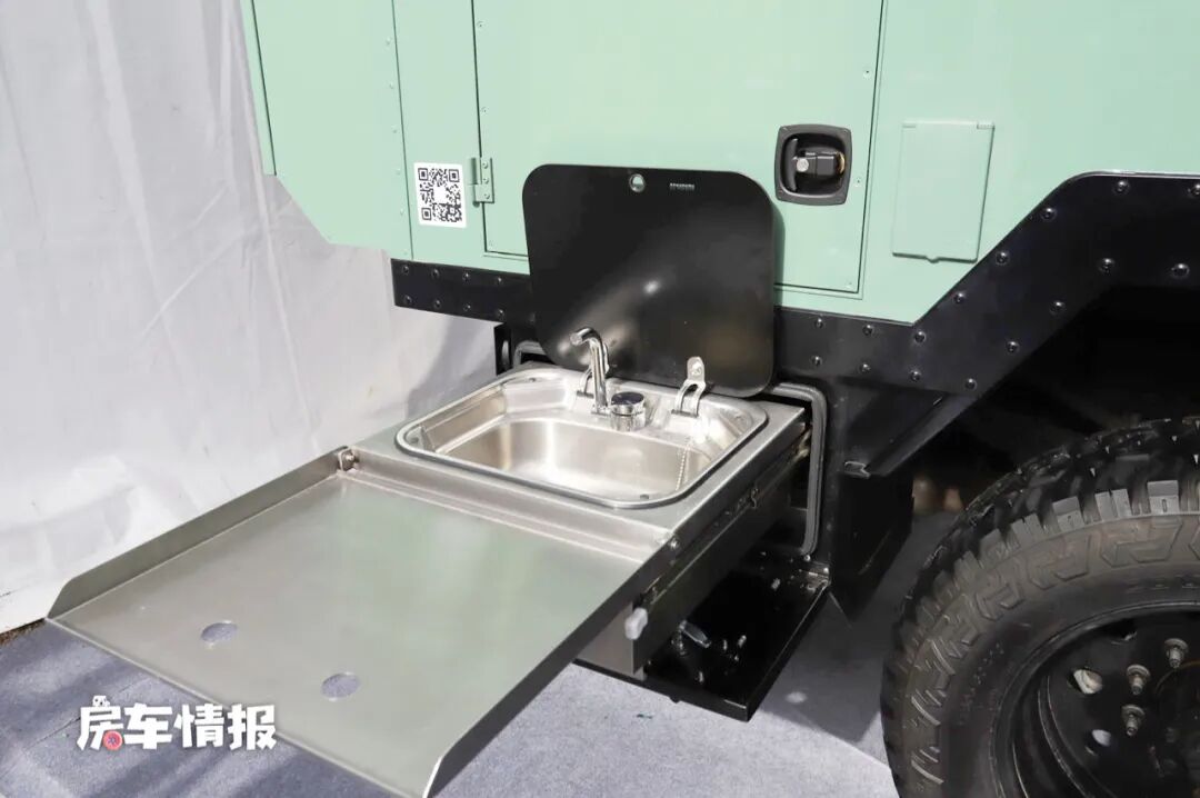 车身右侧的上方同其他房车一样,同样提供了一个手动的遮阳棚,下方的配备了带有防蚊网和电动踏步的房车门,后部带有一台抽拉式的小型外置厨房区,包括了不锈钢水槽和一个燃气灶炉,方便在车外猛火做饭。