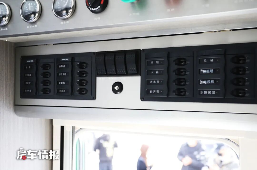 最后看一下全车的水电系统,电路上,这款房车搭载了一台5000W的逆变充电一体机,提供1200Ah的磷酸铁锂电池组,配备600W太阳能电池板,并搭载了全自动大功率混合供电系统和全自动智能电力管理系统,车身外部提供市电接口,内部提供LED灯,并配有电流监控器。