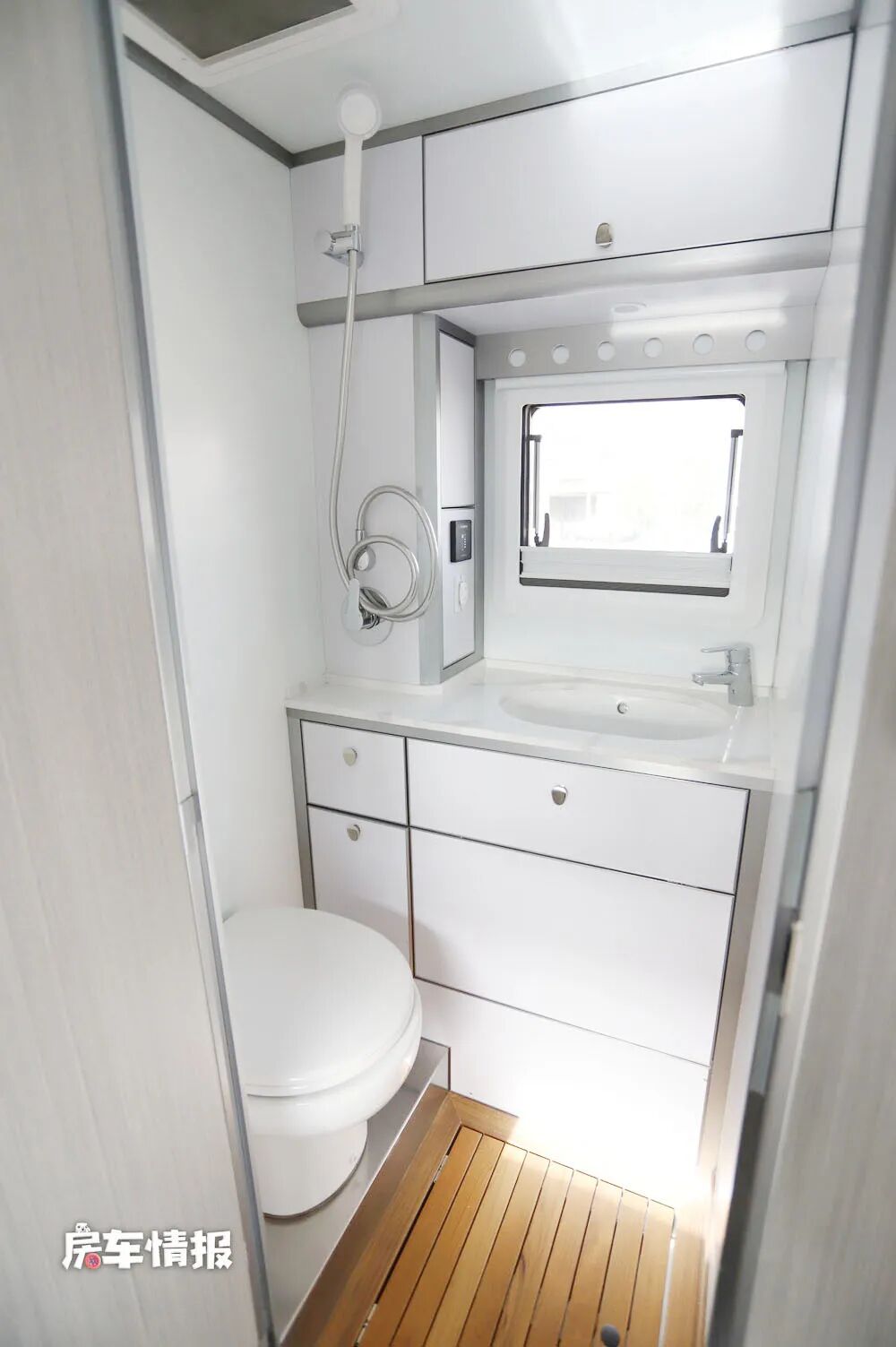 水路上,全车提供了270L的净水箱,95L的灰水箱,85L的黑水箱,并都带有液位感应器,除此之外还配备了全自动水泵和水路系统,提供注水口和前置过滤器。