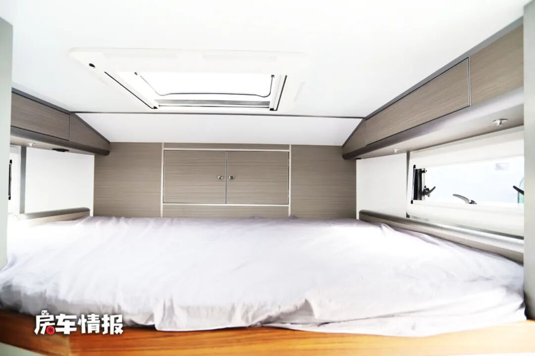 除去沙发卡座床之外,车厢前部驾驶室的上方内部还提供了一张额头双人床,尺寸为1920mm*1360mm,平时可以容纳两个成年人休息使用,并提供了储物吊柜,两侧带有外推窗,采光度也还可以。