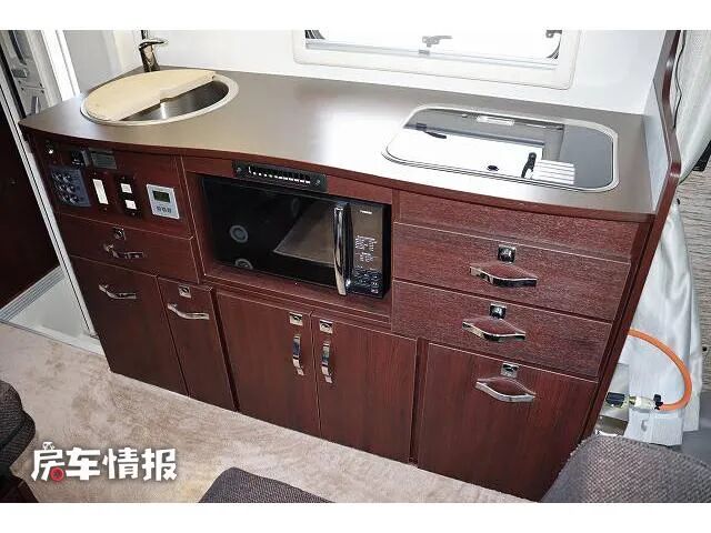 厨房操作台的面积还是比较宽敞的,但即便这么宽敞的操作台还是在侧面提供了可拓展的折叠小桌板,台面的一左一右分别配置了不锈钢的水槽和双孔燃气灶,下方则提供了一台微波炉及多个储物抽屉,足够平时的烹饪需求。