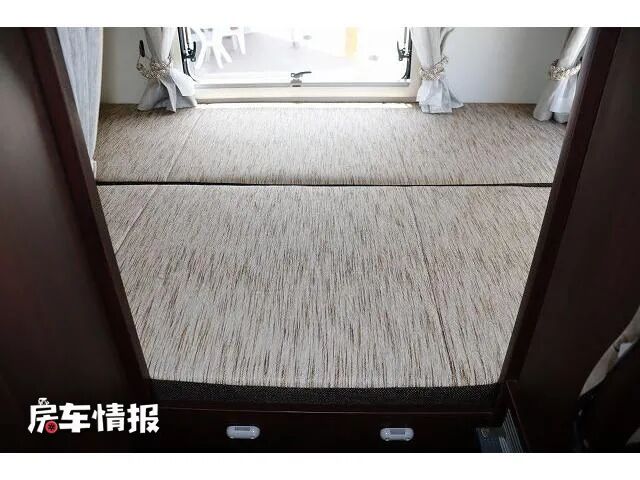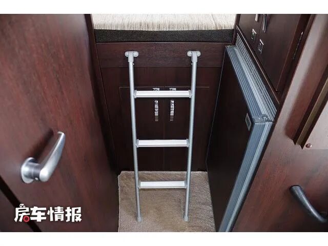 最后是车厢尾部的休息区,因为外部储物舱的原因,所以尾床的高度非常高,需要爬梯才能上去,这点设计对老年人和小孩来说还是非常的不友好。但是尾床的尺寸还是可以媲美后拓展车型的床尺寸,完全可以容纳两个成年人,甚至是三个成年人的睡眠需求,这也是唯一能体现这款房车长度接近6米的最大优点。