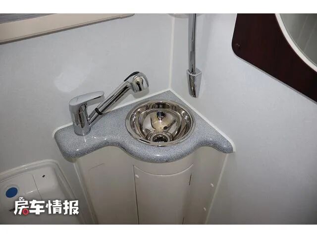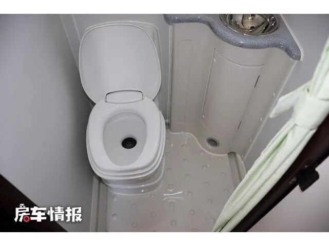与之相对的是全车的卫浴室,内部的空间在近6米车长的同等车型中并不算很大,但是提供了包括马桶、洗手盆、淋浴花洒和梳妆镜在内的基本洗漱用具,可以满足平时的洗漱需求。