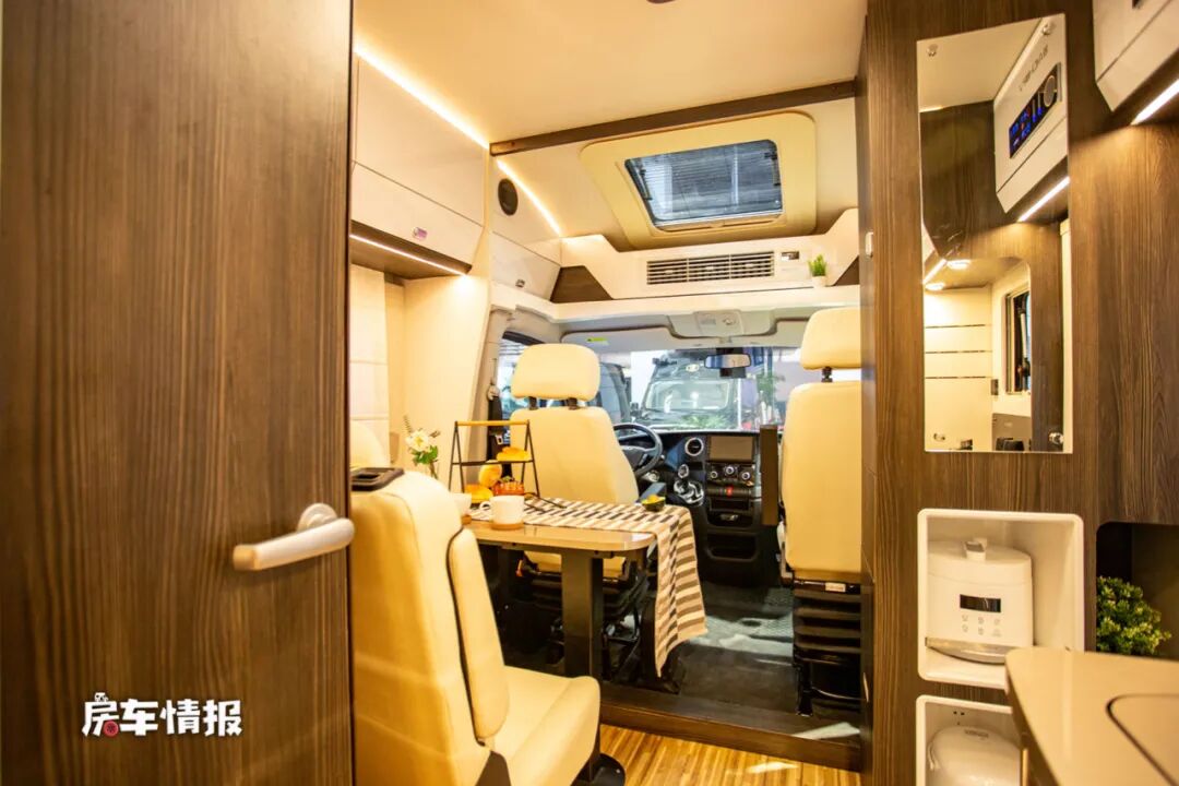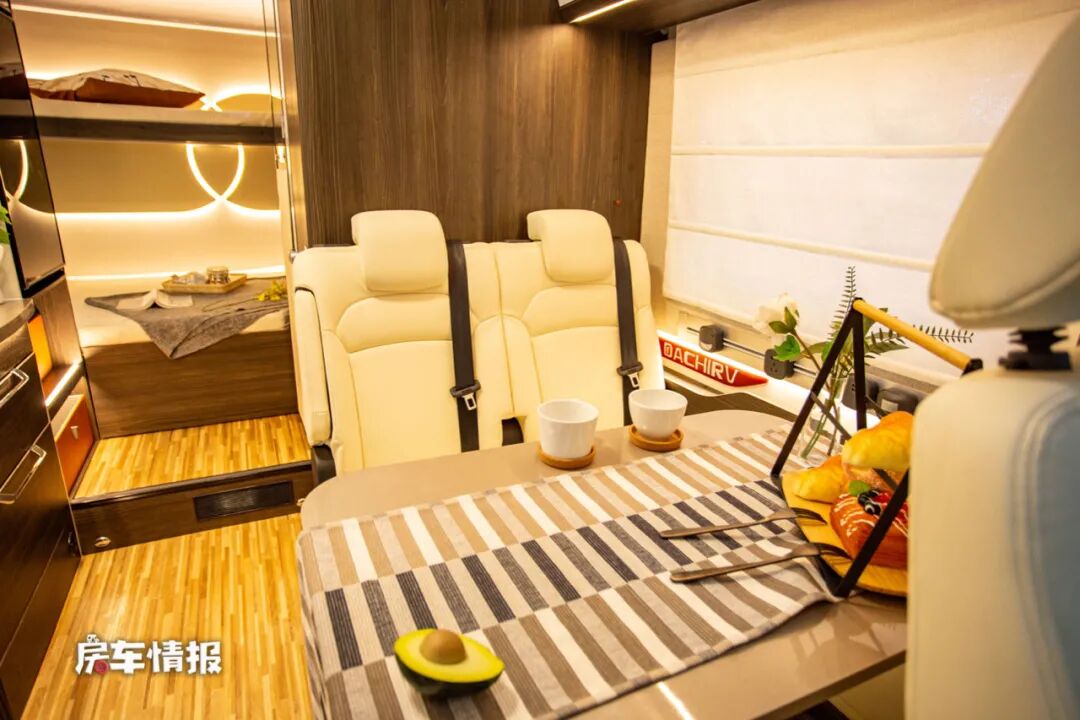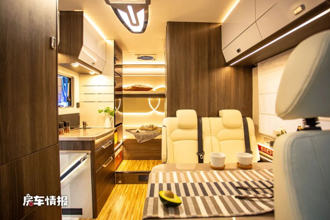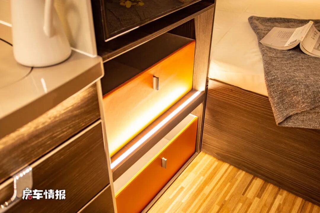 进入车厢内部不由得发出惊叹,真的是太漂亮了,光线也特别的亮,不同于以往我们常见的房车内饰,豪华的就像进入了五星级酒店一样,尤其整体的色彩搭配也十分的靓丽,非常的迷人。