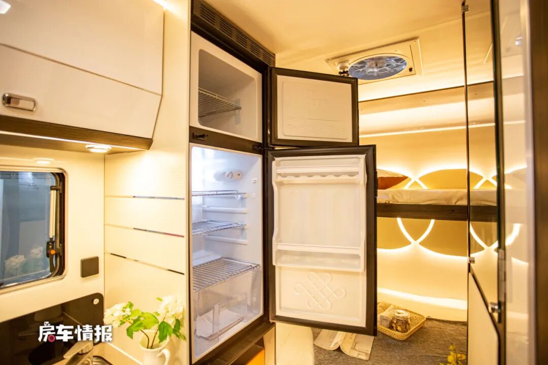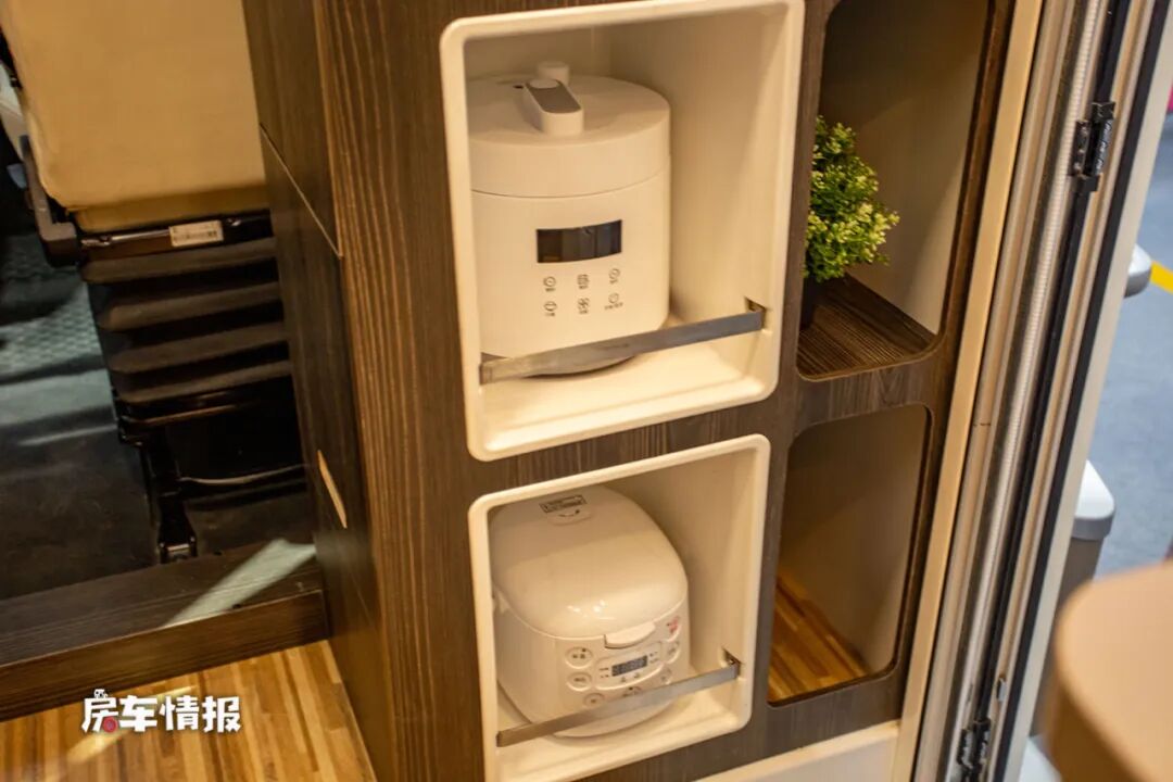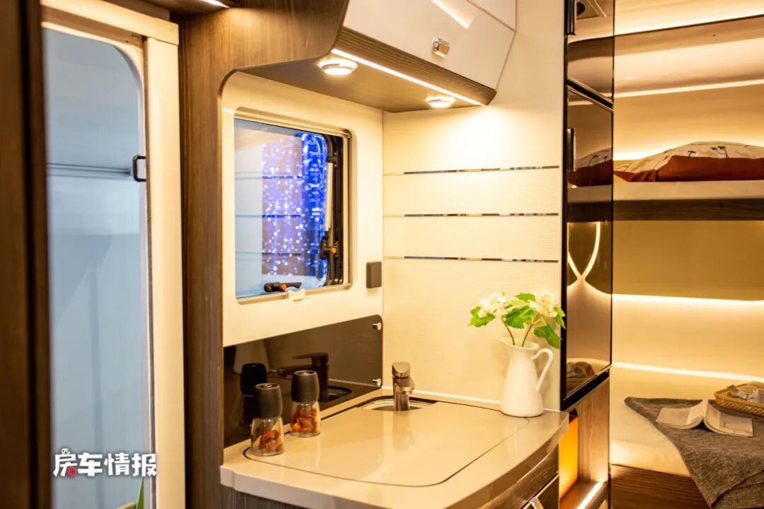 乘客门后方的厨房区域也打造的相当豪华,采用的是集成式的橱柜,隐藏在台面下方的是一体式的洗菜盆,带有水龙头和电磁炉,更加节省空间。
