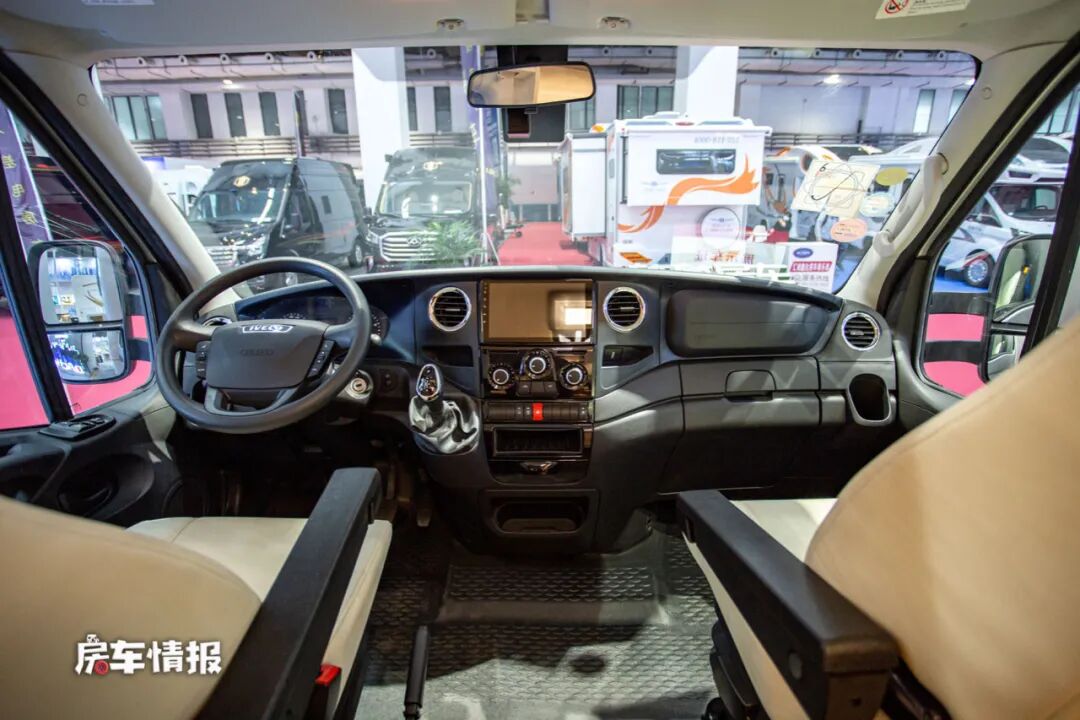 因为采用了最新的依维柯底盘,所以驾驶室内部的设计也有了小小的改动,包括出风口的镀铬装饰环,也提升了整体的档次,同时主副驾驶座椅还采用了更加舒适的悬浮式设计,符合人体工程学设计,并带有可旋转的功能,另外在系统安全配置方面,全车还配备了多功能方向盘、中控触控显示屏、主驾驶安全气囊、ESP9.0、车道偏离预警系统等,为驾乘人员保驾护航。