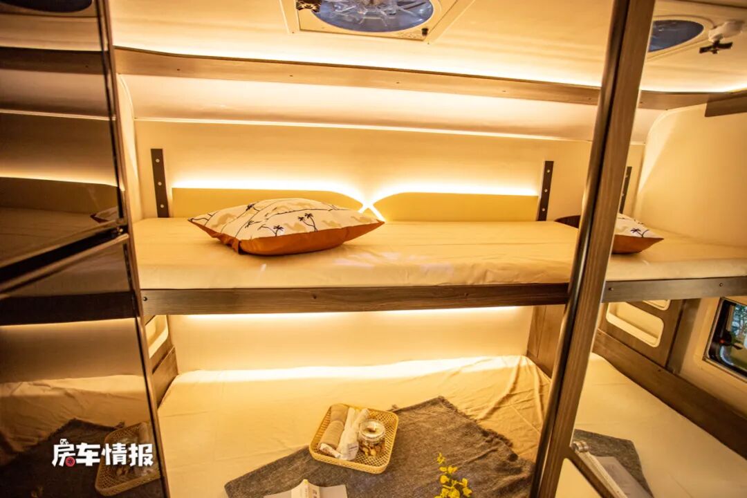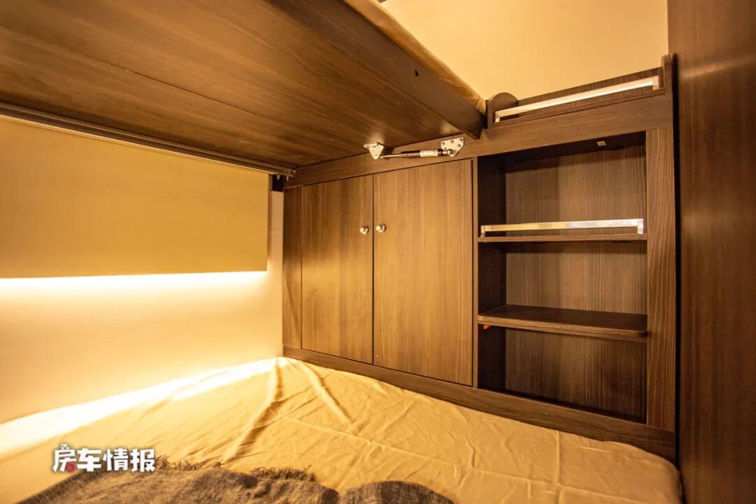 车厢尾部的休息区是上下子母床式的设计,从外面看似乎看不出独特之处,但是我要告诉您,这两张床铺都是电动升降的,您一定会非常惊讶,这两张床可以根据自身需求调节高低,最下方床板下面的空间其实就是车身尾部的行李舱,所以也就是说当你提升床铺位置时,储物舱也就变大了,相反降低床铺时,储物舱也就变小了,当然这样的设计对老年人和小朋友也是非常的友好。