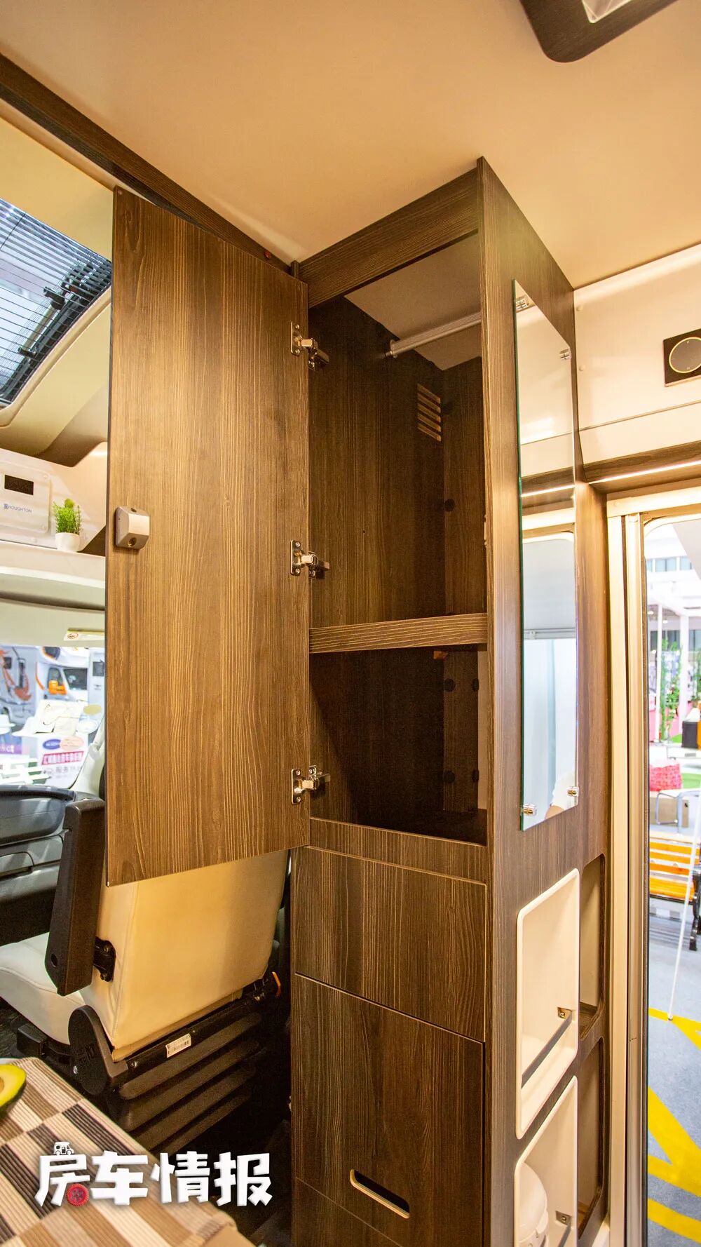 驾驶室与乘客门中间的区域被打造成了立式的储物箱体,带有分隔区域,平时可以分类存放物品,侧面则带有一面半身镜,设计的也非常人性化。下方的两个储物小格,最大的优势是内部自带插座,可以放置电饭煲或者是热水壶等小家电,即便在行车时也可以加热。