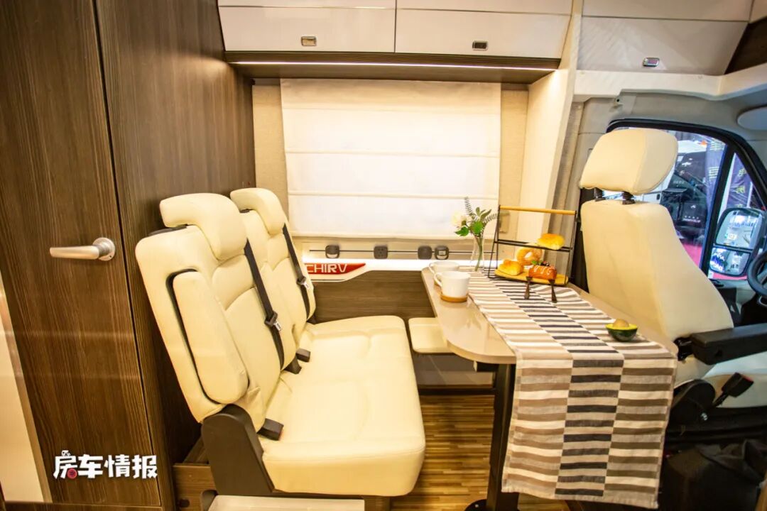 会客区采用了B型房车中常见的双人沙发座椅+升降餐桌的设计方式,座椅都采用的是乘用车级别的座椅,不仅可以提升整体的舒适度,同时也提升了驾乘的安全性。