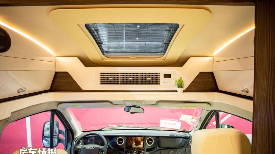 而驾驶室上方的小额头内取消了常见的额头床设计,而是放置了一台48V的车载空调,这样的摆放位置可以让空调工作的效率更高,同时也对后方的生活区不会造成噪音上的干扰。