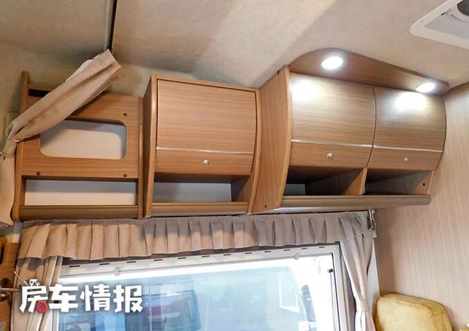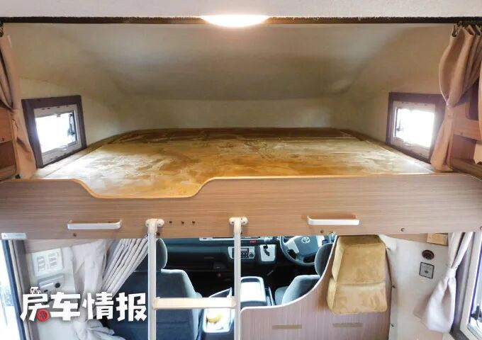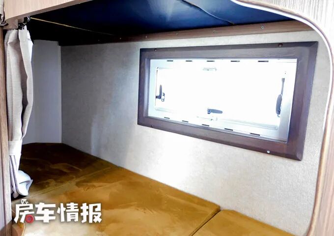 在驾驶室上方的额头区域内,同样是提供了带有可抽拉拓展的额头双人床,两边带有外推窗,既保证了采光也可以通风换气。另外还提供了爬梯,方便平时上下床。