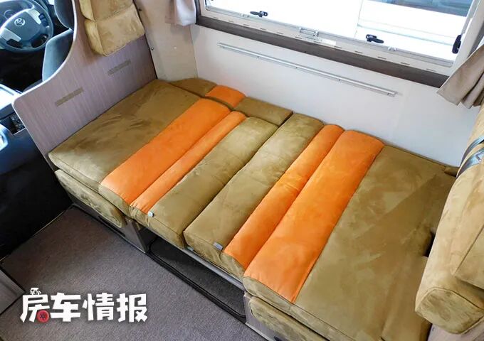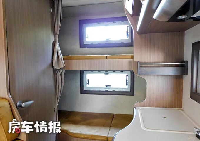 最后是车厢尾部的休息区,整车采用了一个上下床的设计,由于车长不足5米,所以床的宽度达不到双人床的标准,上下床各能容纳一名成年人。