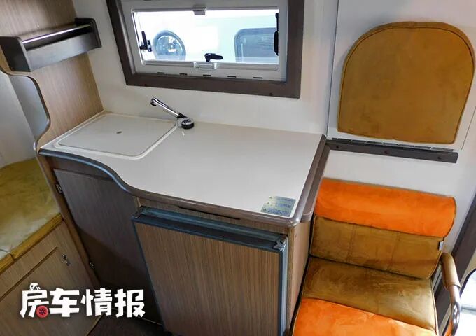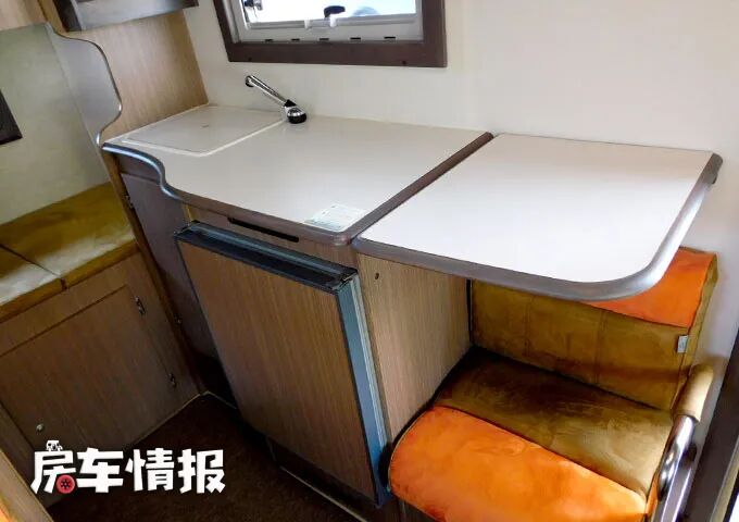 乘客门到尾部休息区的这一块区域被打造成了厨房区,同时还提供了一个额外的单人沙发座椅,厨房操作台上比较简洁,配备了带盖的水槽,下方带有一台64L的车载冰箱,同时全车还带有一台便携式的卡式炉,可以满足平时做饭的需求,另外在橱柜侧面还提供了可延展的折叠桌板,方便后期使用。