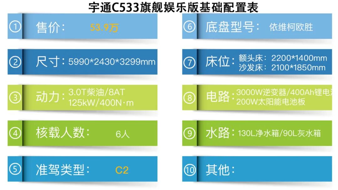 关于宇通C533旗舰款这款房车大家已经很熟知了,这次发布的娱乐版本是在原车的基础上增加了更多的娱乐休闲配备,整车还是搭载了依维柯欧胜的底盘打造的,长宽高的尺寸为5990mm*2430mm*3299mm,因为大额头的设计,所以车身高度超过了三米,平时我们行车上路的时候要注意限高的影响,不过这款车自带限高预警系统,更加保证了行车上路的通过性。
