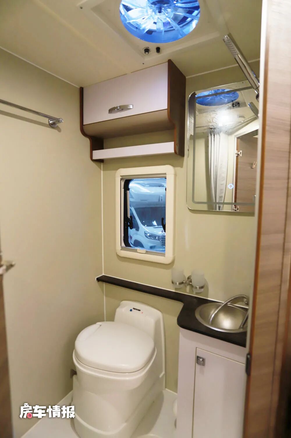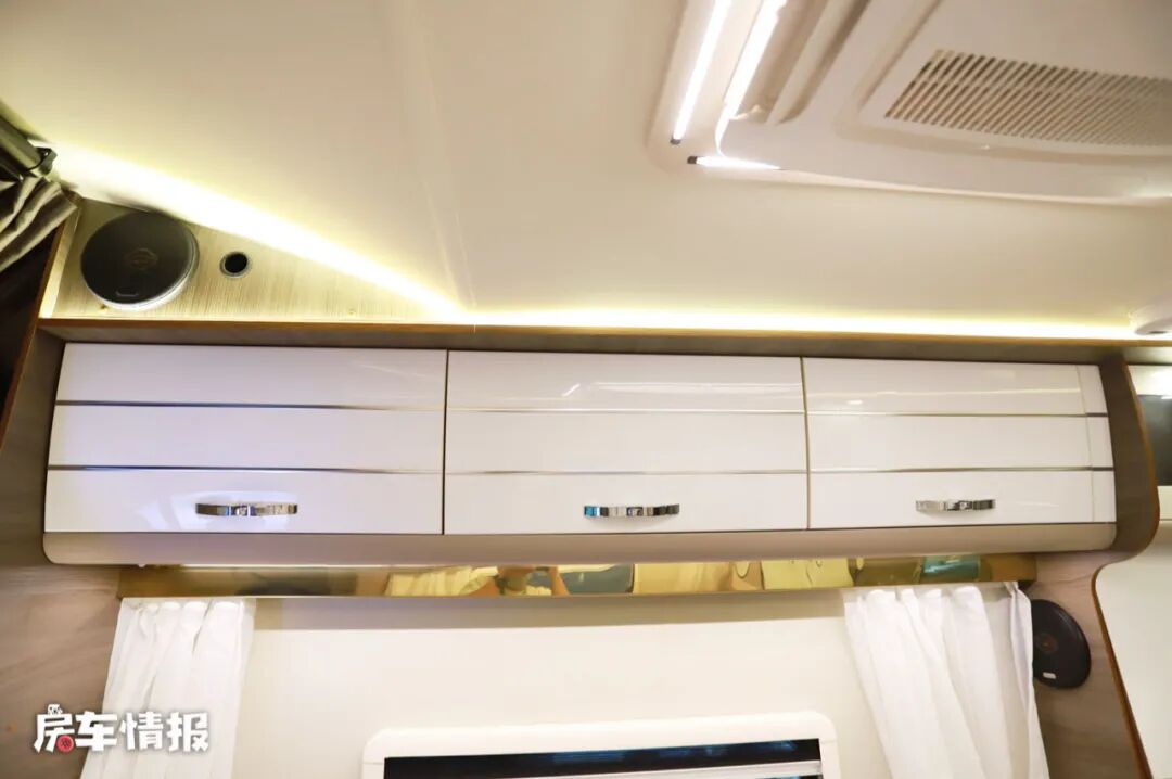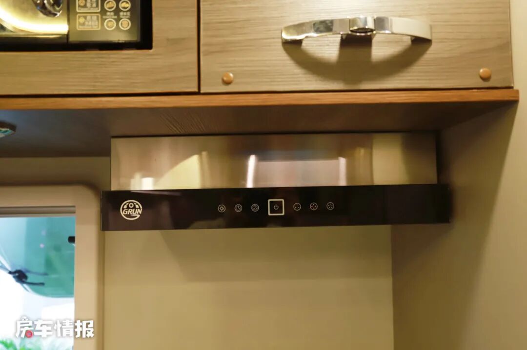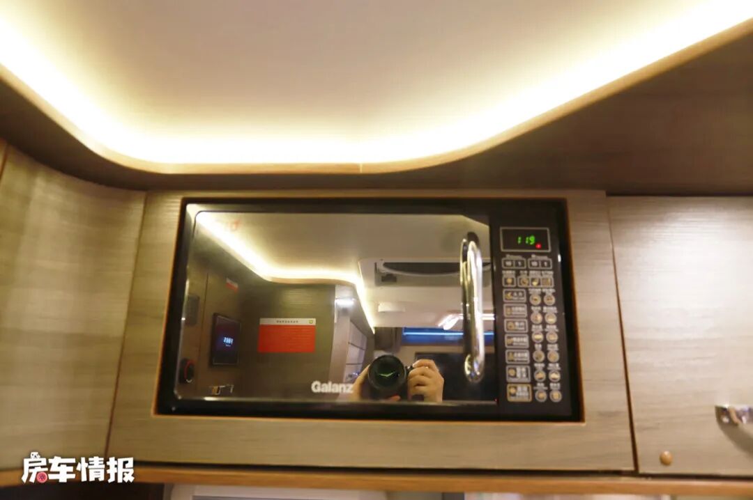 厨房上方提供了抽油烟机和微波炉,也能减少油烟对车内家具带来的影响,另外上下都提供了储物空间,平时存放一些碗筷和烹饪用具还是完全够地方的。