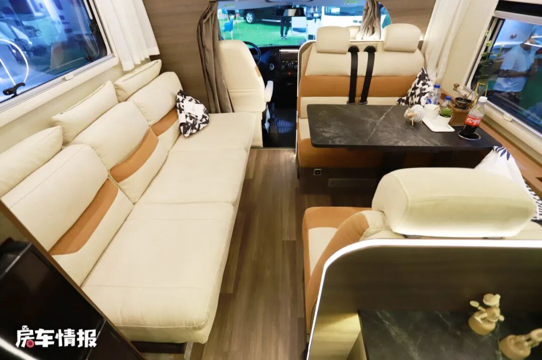 这款房车是采用了一个右后上门的方式,车内的布局和我们以往常见的拓展车型内部布局相似,虽然这款车并没有拓展机构。