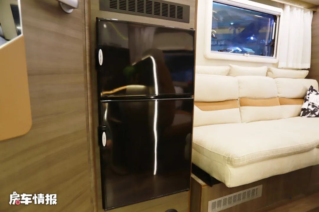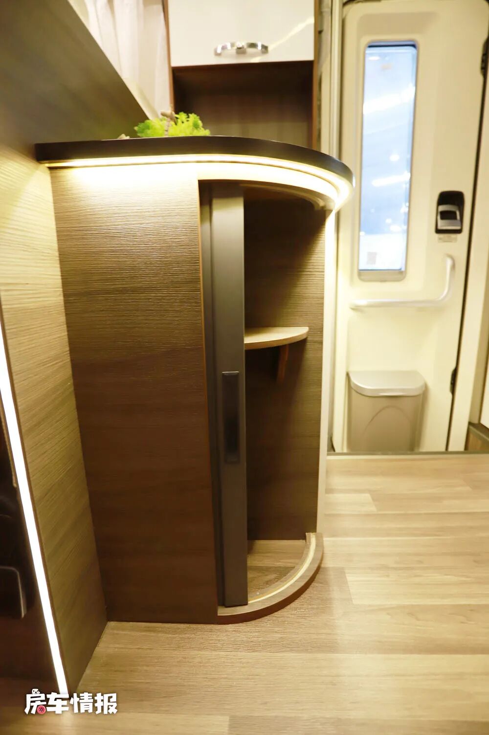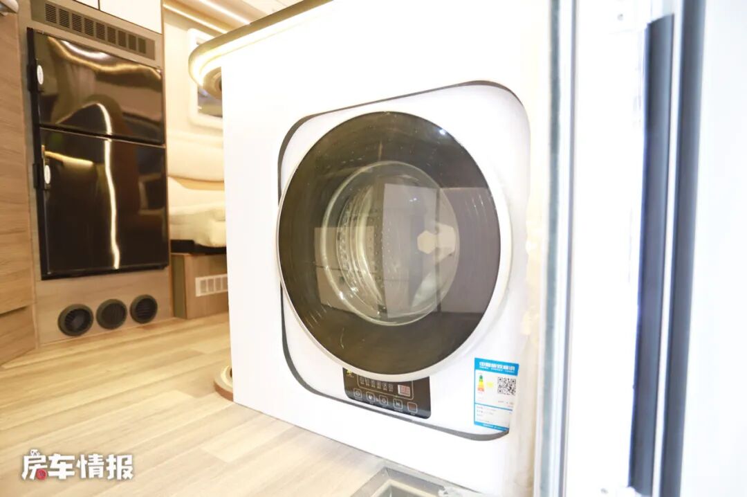 乘客门前方还设置了一个小吧台,不要小看这个吧台,因为后期也可以外接其他的厨用小电器,满足更多的烹饪需求,另外下方还镶嵌了一台洗衣机,洗一些平时轻薄的衣物总好比手洗。