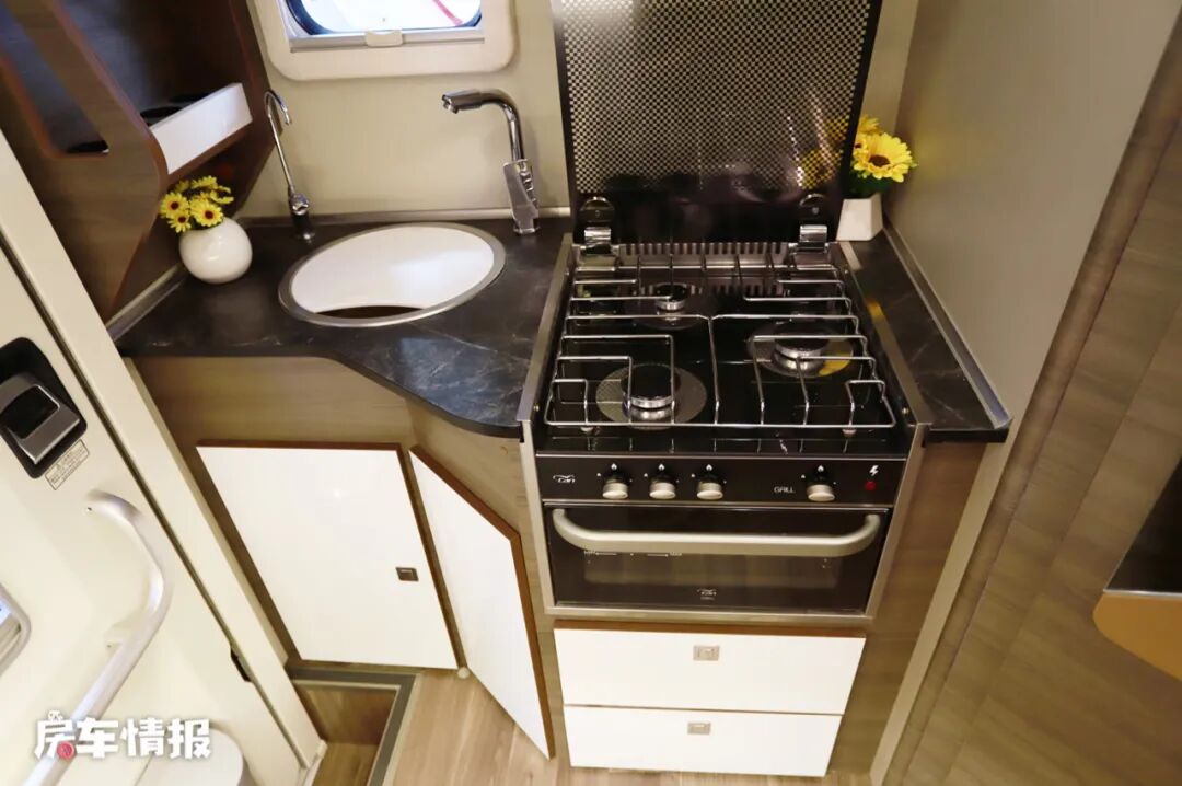 好多对房车感兴趣的朋友们一看到我之前说是后上门,就能猜到这款车采用了一个后置厨卫区的设计,厨房区的设计还是挺高档的,因为提供了一个集三孔燃气灶和烤箱为一体的集成灶台,旁边也提供了带盖的不锈钢洗菜盆,并且提供了直饮水的功能,有宝宝的家庭更适合这种的设计。