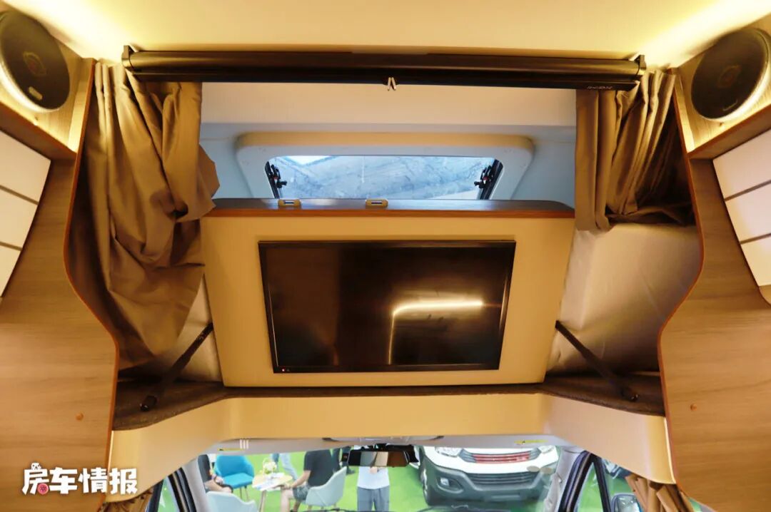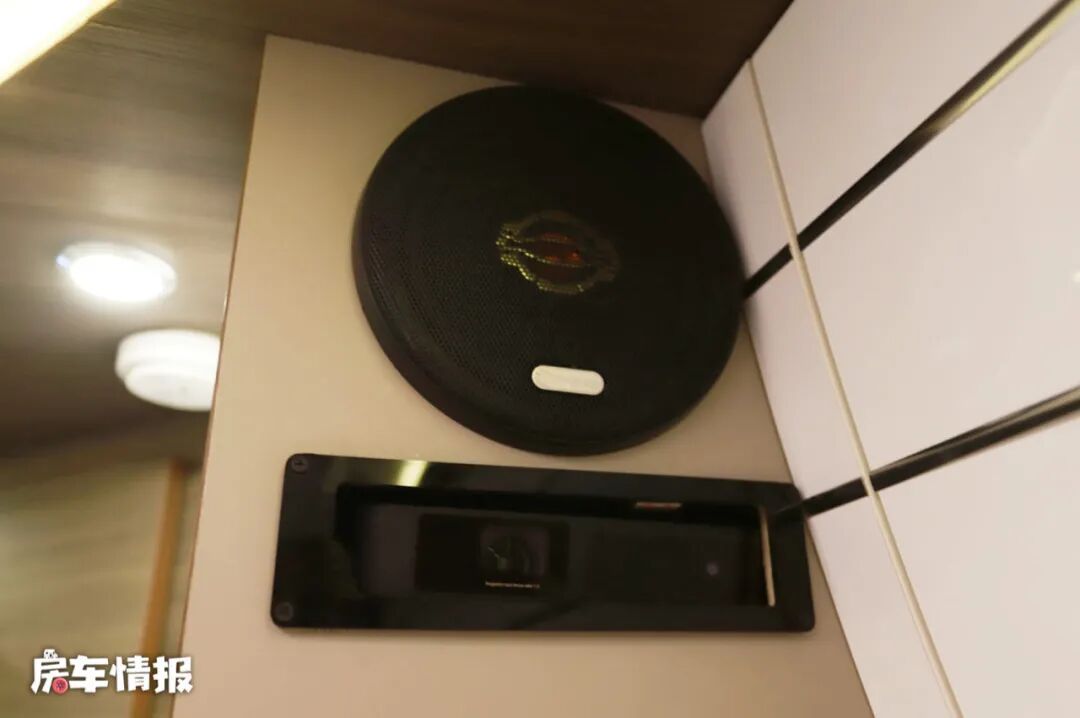 说了这么半天你肯定会问,这些都是普通配置啊,没看见有什么新颖的啊,那你就错了,因为这款房车除了外置的40寸电视在车内还提供了一台24寸的液晶电视,位于额头床的床板下方,除此之外,这款房车还配置了当下比较流行的投影仪和幕布,这样到晚上光线暗下来的时候,就可以打造一间私密的个人观影空间了。当然好的影音视听环境少不了扬声器,这款车还配备了多个音箱设备,提升了整体的影音视听效果。如果您个人特别爱好唱歌,后期也可选装点歌台,满足更多的娱乐所需。