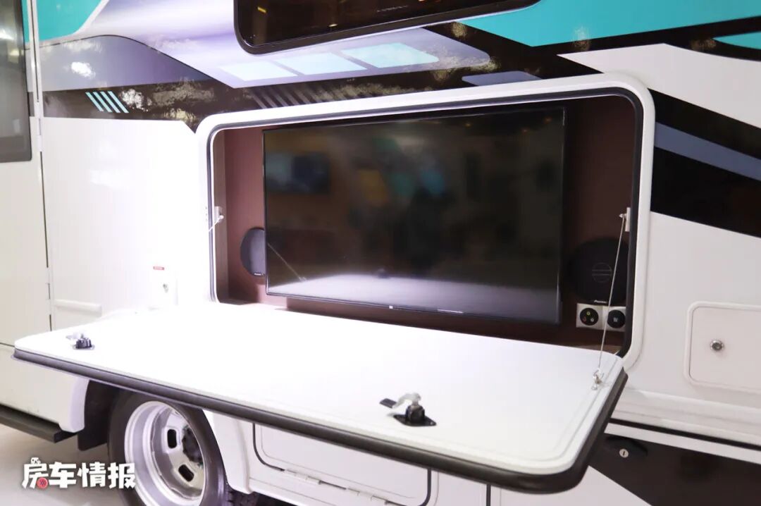车身外部还是提供了比较丰富的生活配置,包括带有LED灯的户外遮阳棚、抽拉式燃气灶和储物舱,另外还配备了一个最能体现娱乐版性能的配件,就是在右侧的中部的外置翻板中隐藏了一台40寸的液晶电视,还搭配了两个扬声器,也就是说平时天气好的时候坐在遮阳棚下就可以看电视啦,再配合车外的灶台,就可以一边吃饭一边享受娱乐休闲的时光了,外出旅行带着小孙子他也不会感到无聊了。